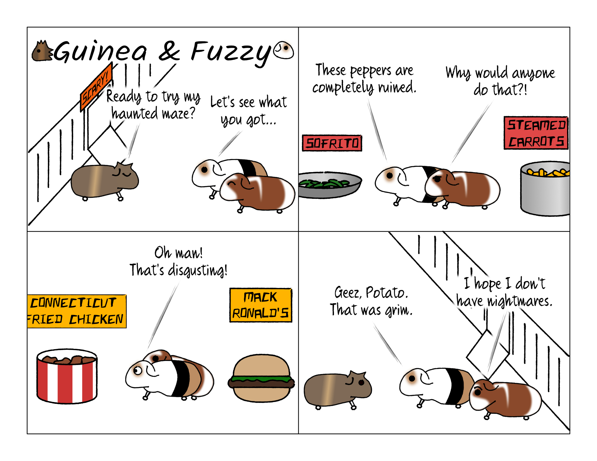 Have you ever been to a haunted maze at a Halloween event in a theme park? They're full of all kind of gory gruesome stuff. This is the guinea pig equivalent. Ruined vegetables and cooked animals packaged for eating. Definitely horror movie material.