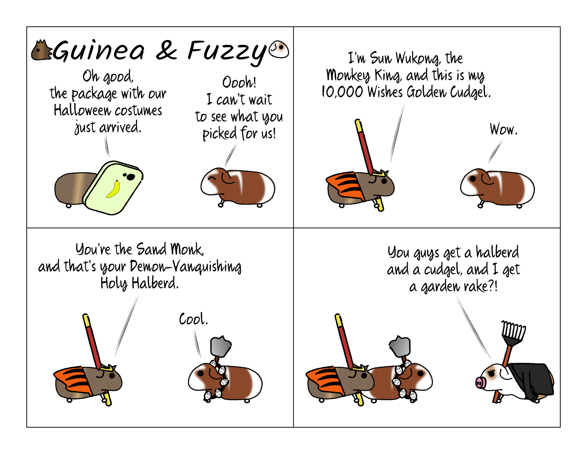 These are the actual weapons that the Journey to the West characters carry. The "cudgel" could be called a staff, but it can grow and shrink at will. The halberd sounds cool. A halberd is a spear with a sword-sized blade at the end. But the one this character is usually pictured with looks more like a paper fan, for unfortunately. That means I actually prefer Zhu Bajie's weapon, even though it's just a rake.