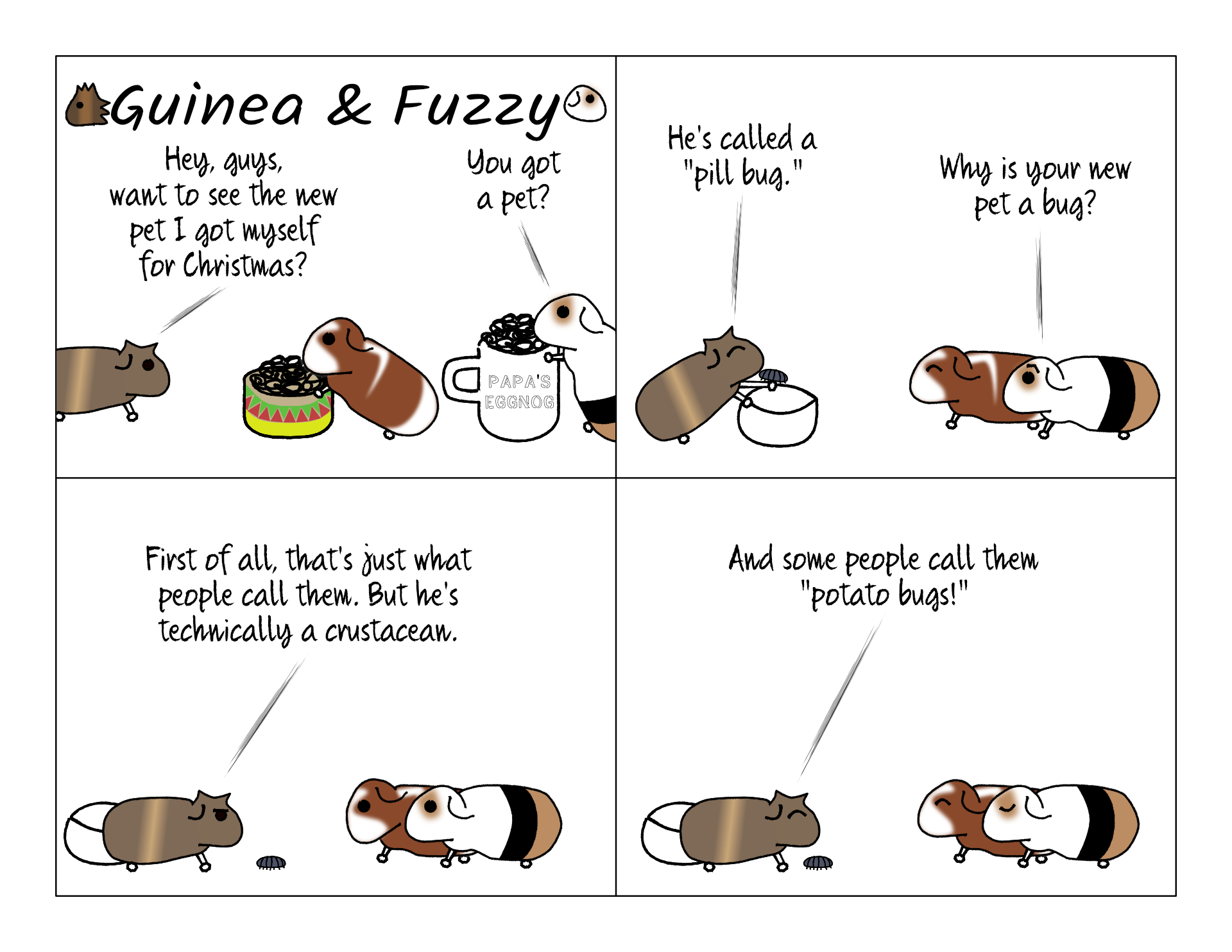 Maybe it's less common now. But I certainly knew them as "potato bugs" when I was a kid. I was not aware that they were actually associated with potatoes, that's just what they were called. I guess "roly-poly" is another common name these days. They seem to be the right size to be a pet for a guinea pig. And Potato would probably be careful enough to take care of one.