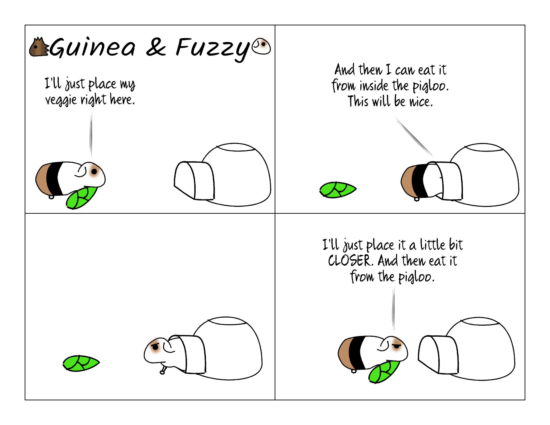 This is the other problem with putting the food out of the pigloo and then going in to eat. It's easy to misjudge the distance. The first time Fuzzy did it, he was off by a lot, and the look of disappointment on his face was pretty cute.