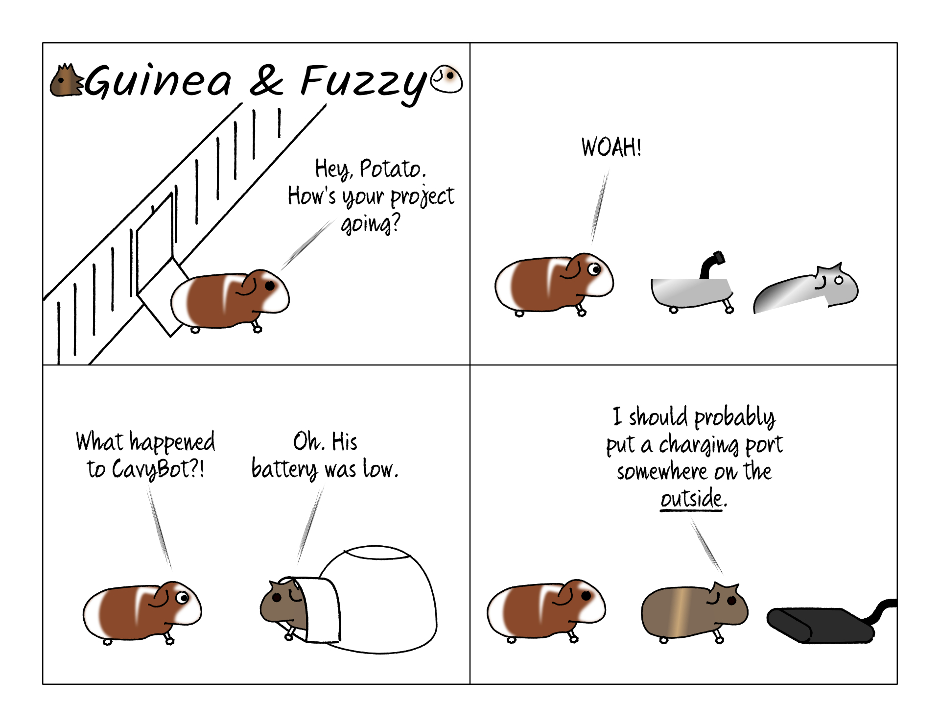 All the moving bits of a guinea pig are near the front and back, so it would be hard to find a spot for the battery other than the middle. He still could have put a charging port somewhere, but maybe he didn't have the parts. We haven't seen Potato getting any components delivered to the house.