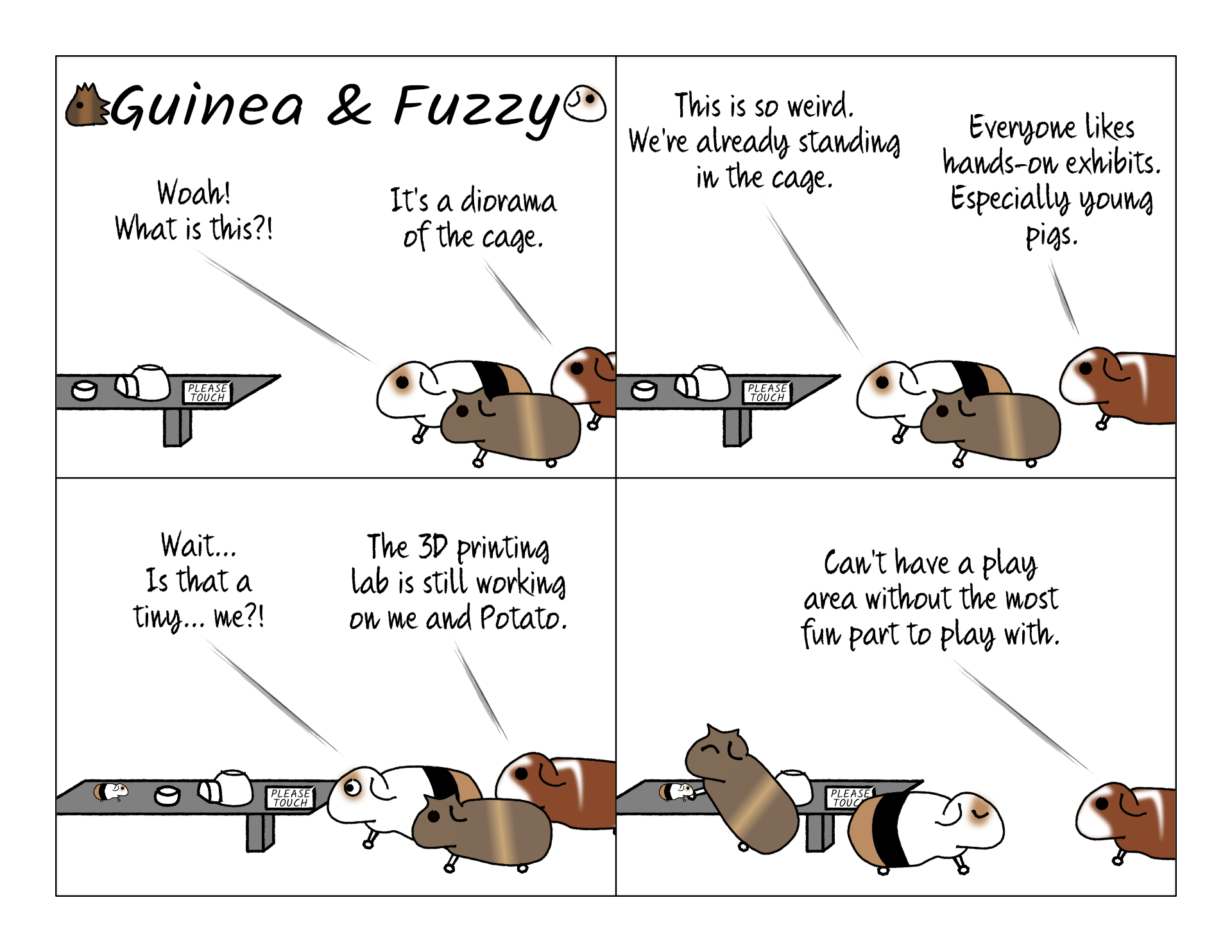 I wish I had a 3D printed tiny Fuzzy. Or any of our piggies, for that matter. But what I'd really want are plush versions. We have a plush version of Fuzzy, but it's baby sized, and not customized, so it only kind of looks like him. It's white, brown, black instead of white, black, brown. And I couldn't find one that looks anything like the other pigs.