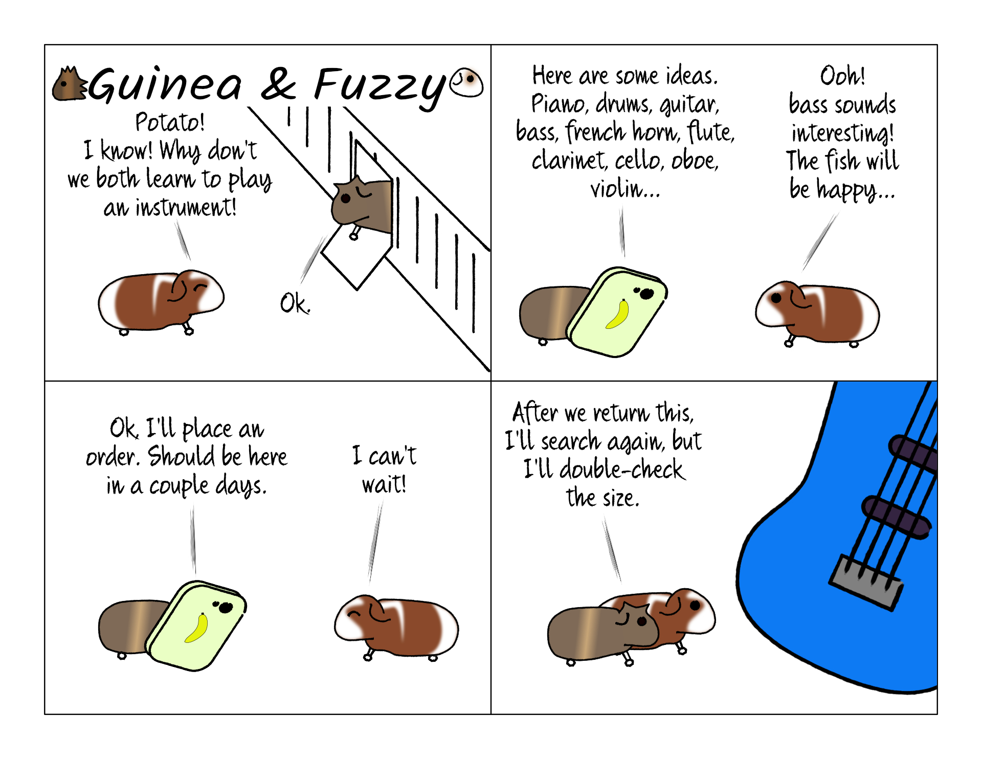 It's too bad you can't get instruments for guinea pigs. It would make a good hobby for them. I think bass is a good instrument for Bean, but I don't think the fish will like it in the way he thinks.