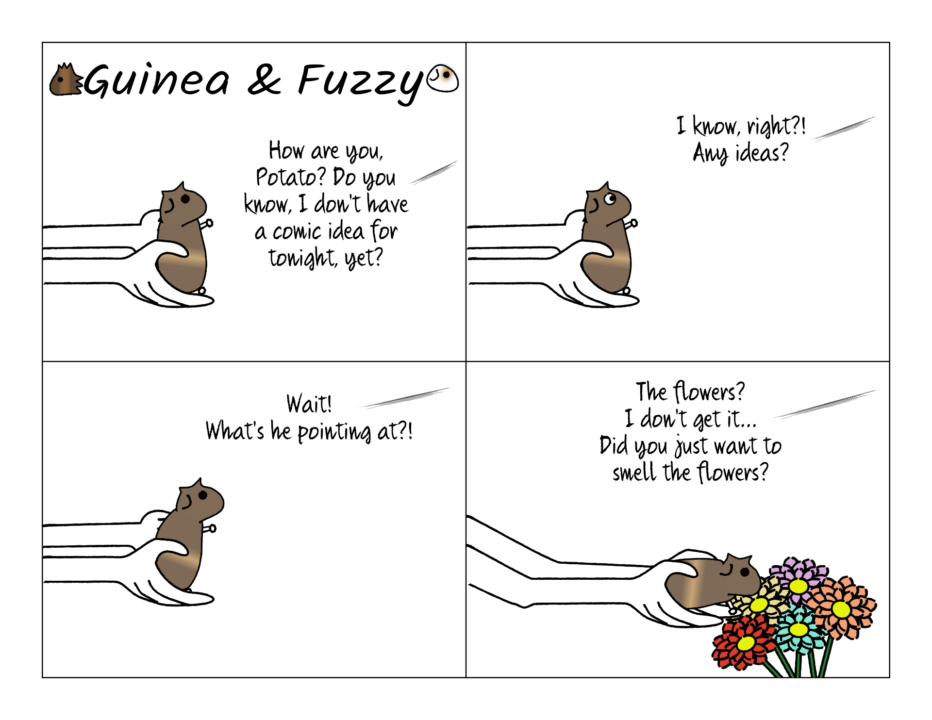 We had a bouquet of flowers on the dinner table near the cage and Potato seemed very interested. So I held him up and let him get a good look. The pigs prefer green veggies, and the only flowers they eat are the ones on sprouting herbs, so I don't think he wanted to taste them. Maybe he was just curious what's so colorful.