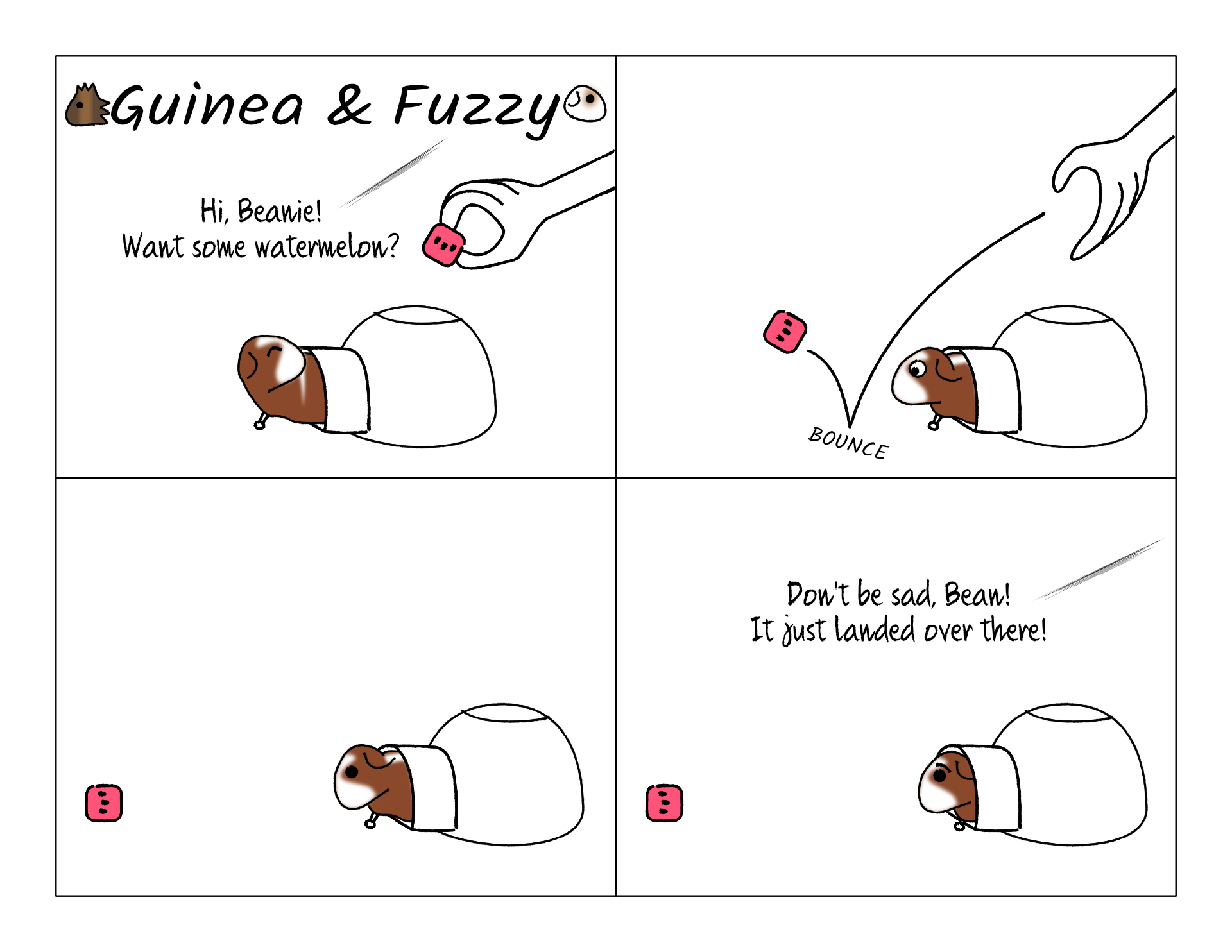 Sometimes this happens to the pigs. Most often to Bean, because he's the one who's most often hiding in the pigloo when we try to give them a snack. We are trying to keep our hands clean, so we just drop a little treat into the cage in front of the pig. But it bounces or rolls away, and because they can't look down, they don't know where it went.