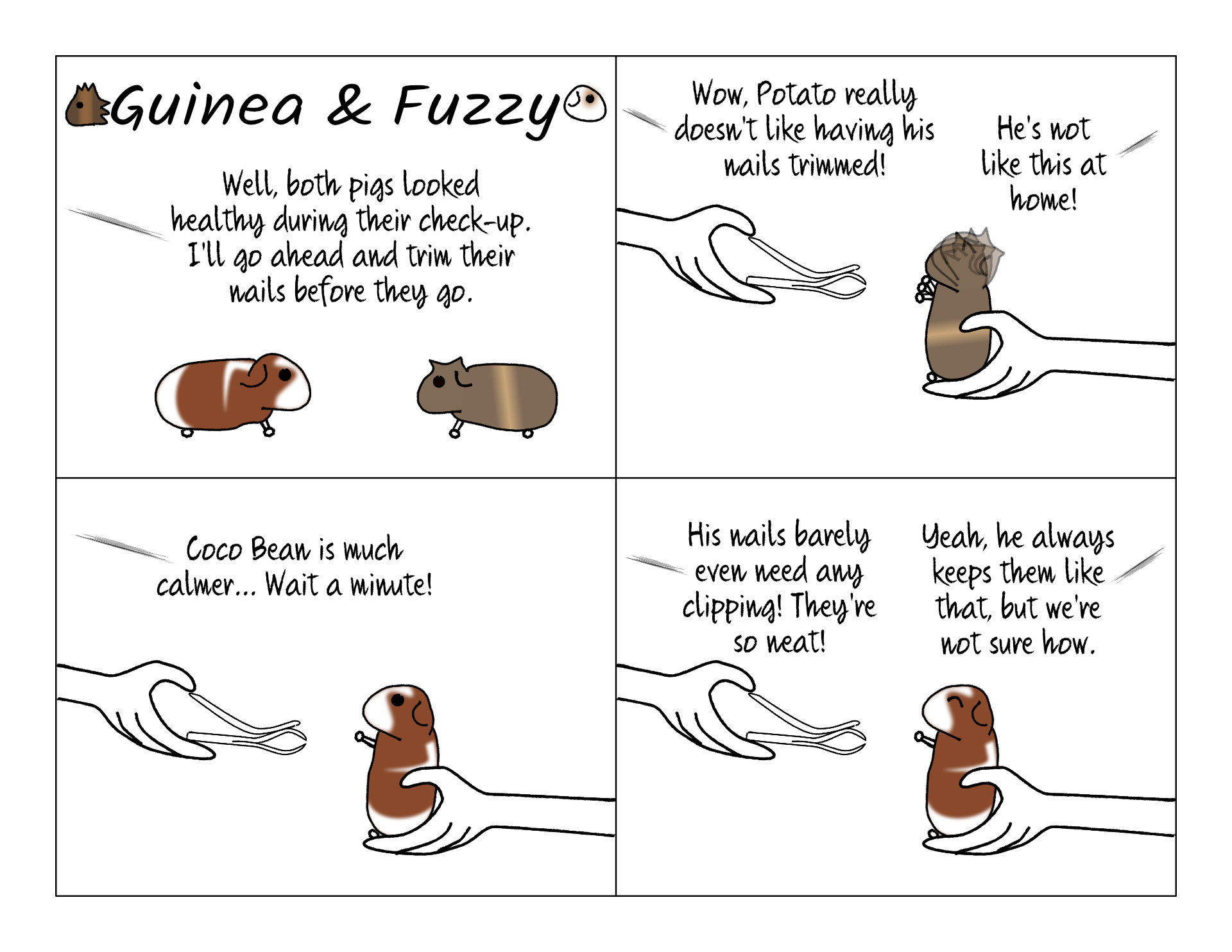 There goes Bean, showing off his pedicure again. The vet had never seen anything like it before either. Somehow he keeps his nails pretty short and perfectly sharp. Supposedly guinea pigs in the wild do this by walking over rocks, but we rarely see Bean walking at all. He doesn't even like to climb the ramp to get into the cage. I think he just chews his nails.