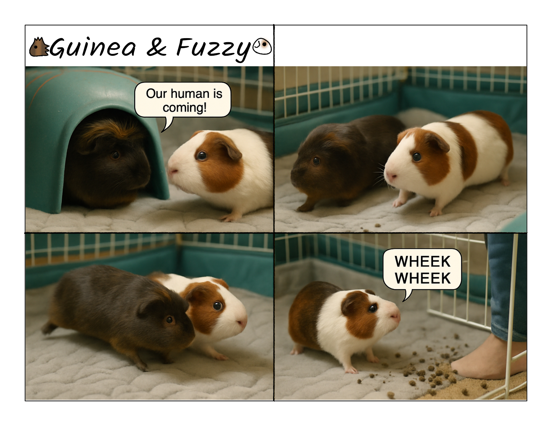 I think this is the fourth version of this comic? I went through several different attempts to get AI to generate a photo-real version of our first comic ever, and they all failed in amazing ways. First I provided the AI with photos of the pigs and described the original and asked it to convert to photo real. Instead it made up an entirely new comic, and it used Potato and Bean, who it had seen before, instead of Guinea and Fuzzy. And the punch line made no sense, but at least it looked good. So then I just gave it the original drawing and asked it to convert that. It gave me weird chunks of text carved in stone that didn't look like a comic. So I gave it the hand drawn version and it gave me weird fragments of guinea pigs merging with a human's hand in four panels.