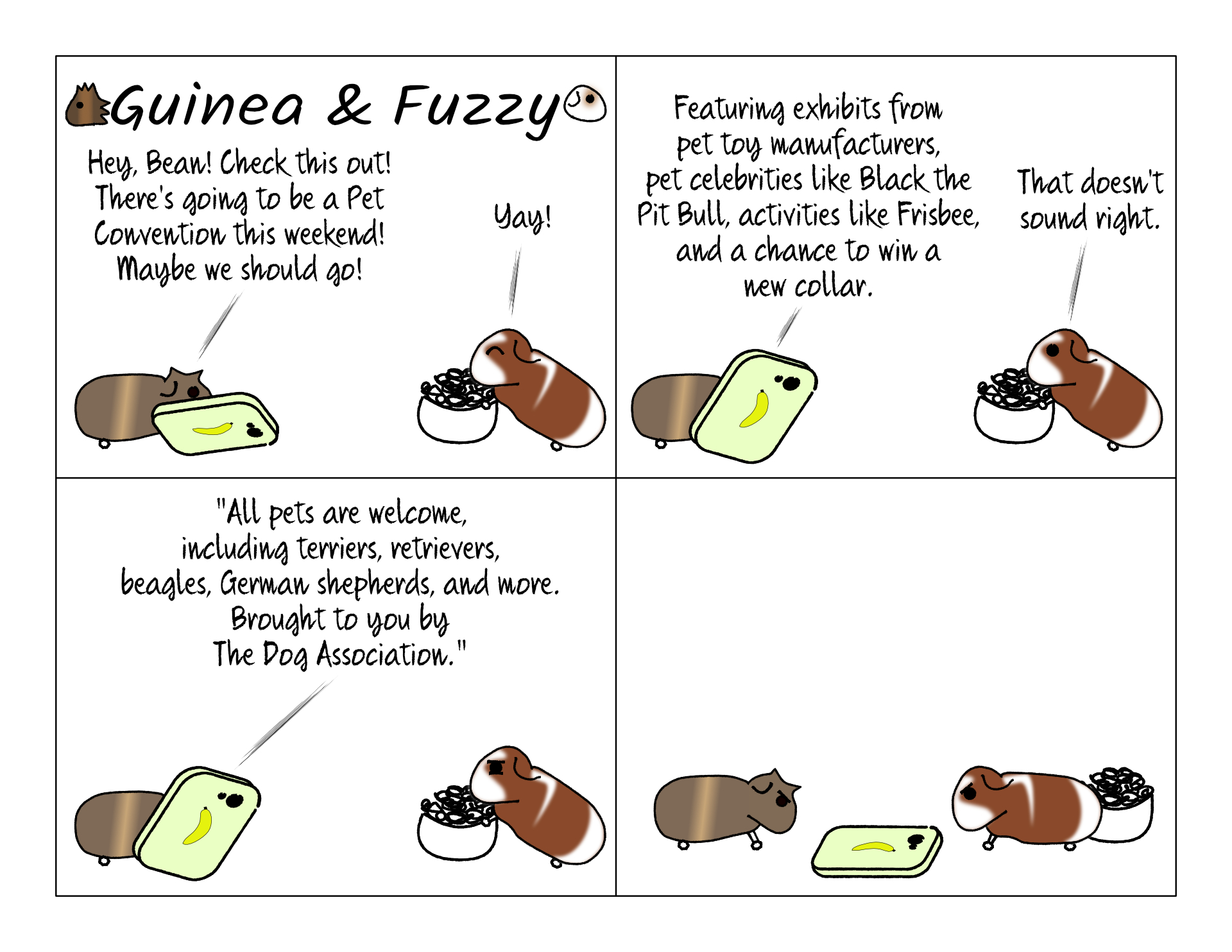 The constant tendency to use the word "pet" as a synonym of "dog" can be very frustrating. I was looking for something to do on a weekend and I ran across this pet convention. I was briefly excited until I started looking at all of the photos on the website were of dogs. The "celebrity guests" had names that sounded like they might be other animals, but when I googled them I found out they were "dog influencers" just named after other animals. The whole website didn't ever make any admission that they were dog-only, but it's clearly because they forgot other pets actually exist. I looked around the country for other pet events, and I found a few that included cats, lizards, and birds. But nothing for guinea pigs. Pretty dissappointing.