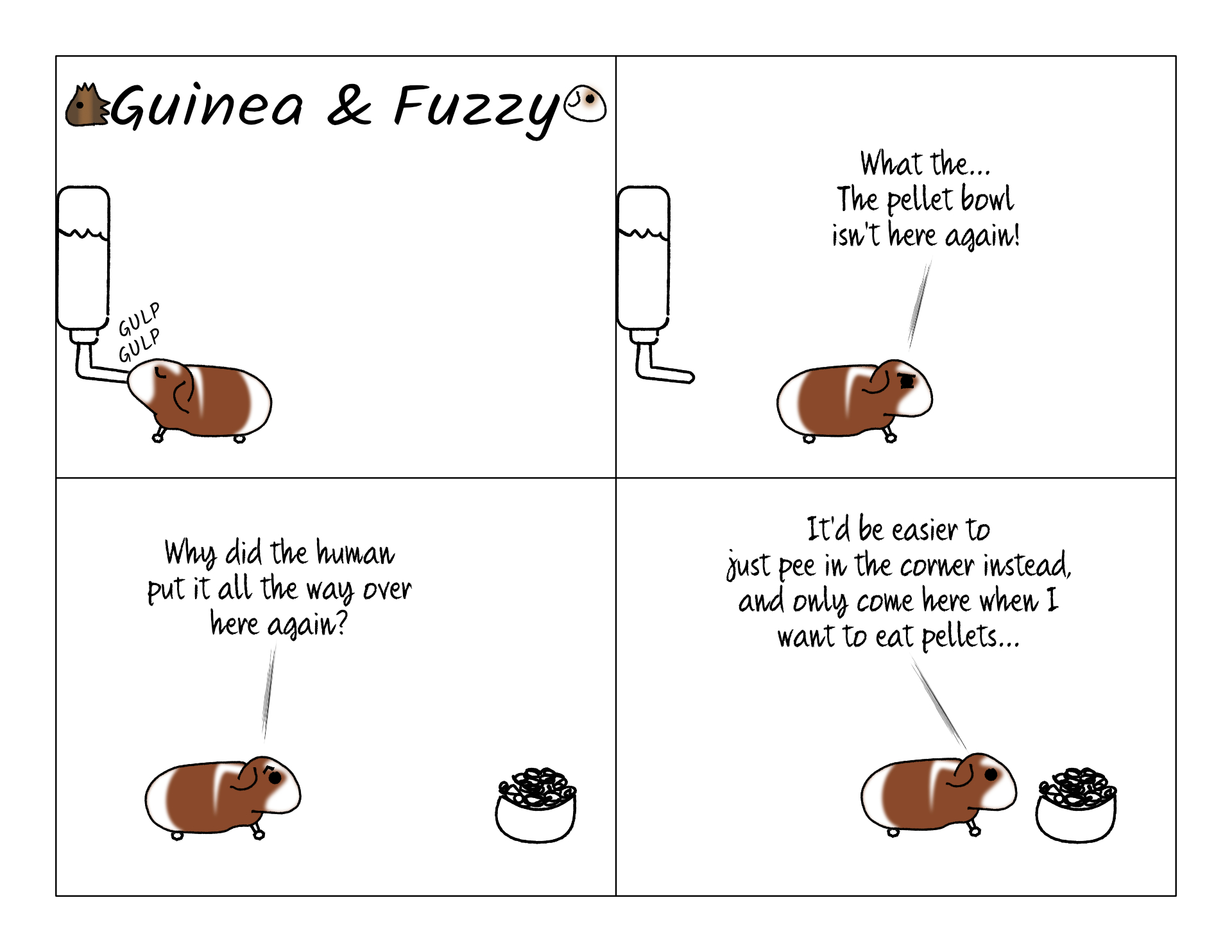 At the time I wrote this, I believe that Bean was just being careless and peeing in his pellet bowl. I should have known better, since he's actually much neater than any of the other pigs with his bathroom visits. But it was definitely Bean, since he was always the one I'd see near the bowl. Turns out I'm pretty sure he would get a mouth full of water, then bring it over to the pellets and use it to soften them up before eating. I think he liked it that way when they were freshly wet, but Potato didn't, and neither of them liked pellets that had been soggy for a while.