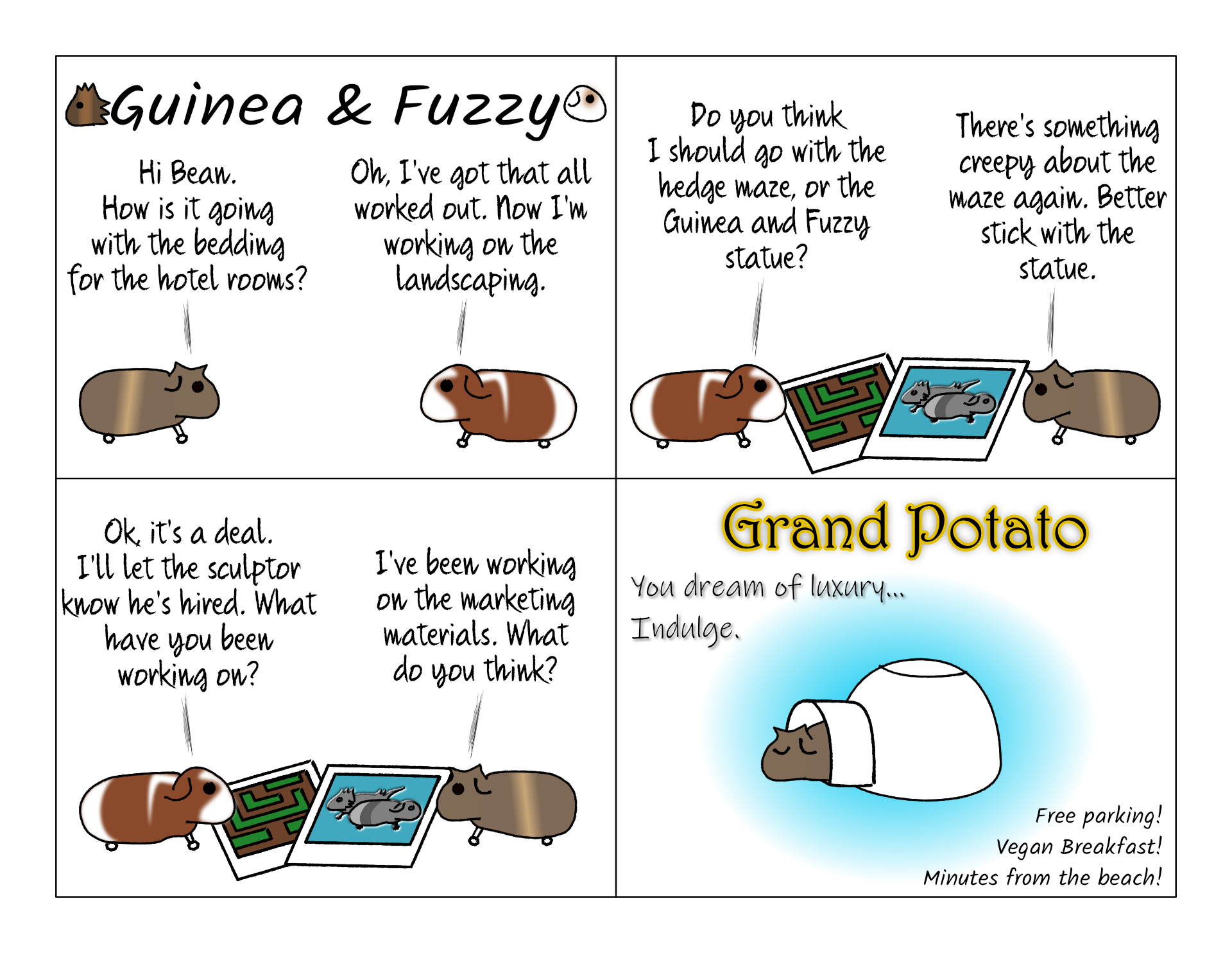 I'm sure Potato could do some good graphic design on his phone for marketing materials. But I don't know how he would print them. Maybe all this animal hotel traffic is driven by digital marketing?