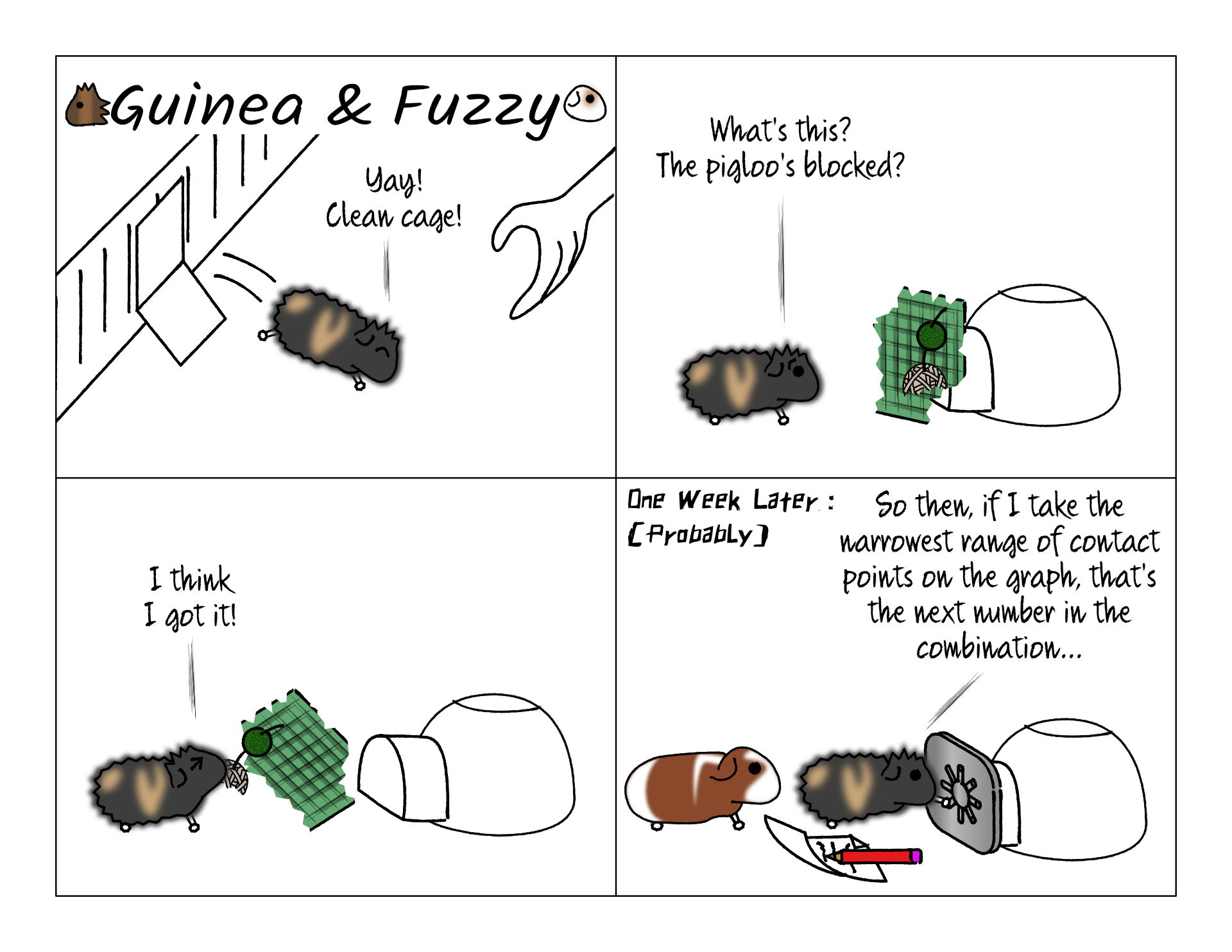 When I noticed that Grizzly liked the chew toys more than everyone else, I started setting them up in different ways every time I cleaned the cage, to keep him entertained. Soon I tried blocking the pigloos differently each day to give him a little puzzle to solve. He seemed to like it.