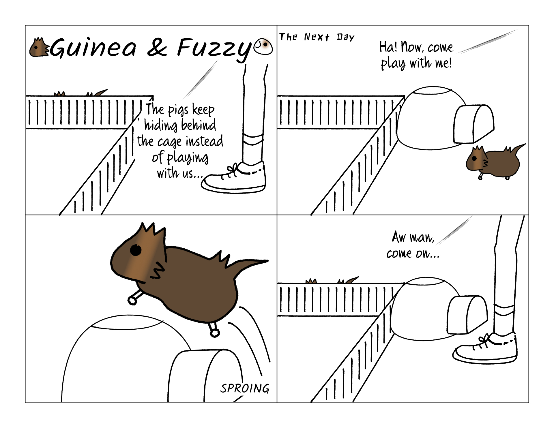 The pigs used to love to hide behind the cage and eat their hay instead of coming out to play with us. So one time we had the idea of blocking off the path to the back of the cage with the pigloo.