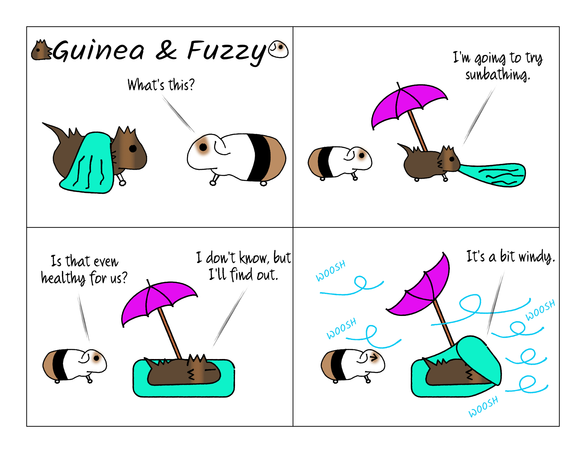 Sun bathing is not healthy for guinea pigs. They can handle a little bit of sunlight, but prolonged direct exposure can be very dangerous. So they should always have a cave to retreat to. That's why they're called cavies! At least he brought an umbrella, so he's not totally exposed.