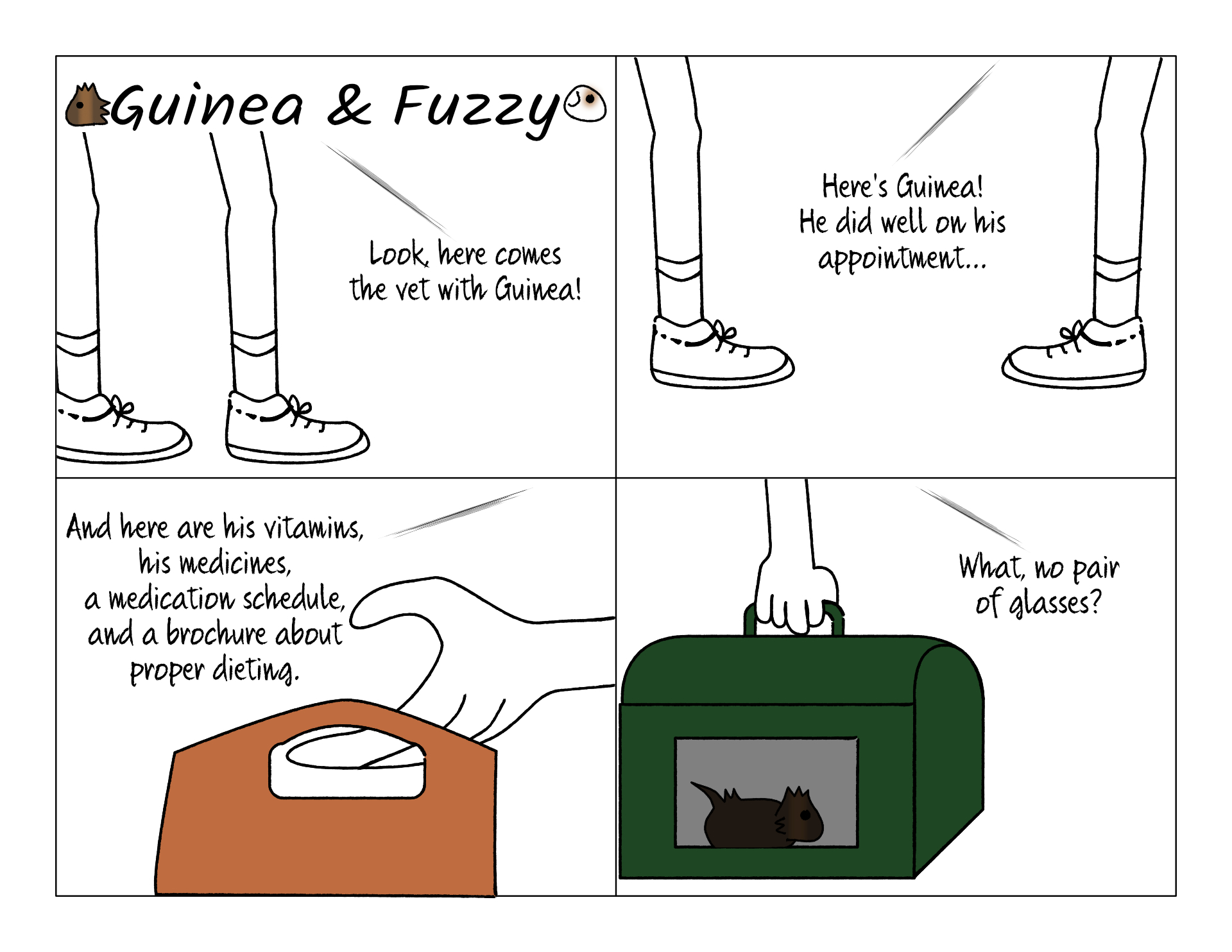 We were very happy to see Guinea after waiting at the hospital for him for hours. We had walked around a nearby nature preserve, played a bit of Minecraft in the car, read books, ate all our snacks, and drank our water bottles empty. But fortunately he was well taken care of and looking good when we got him back, so worth it. He was happy to see us too, wheeking at us through the carrier. Especially happy when he saw the carrot we were saving for him.