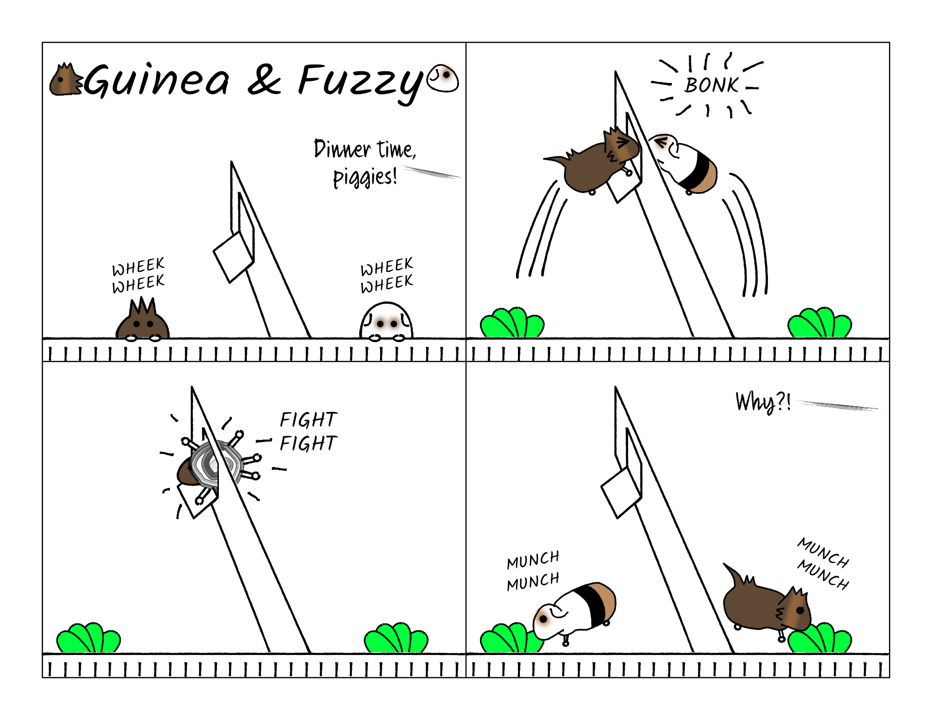 Usually the pigs take their stations when they suspect it's about feeding time. They each pick a side and fix us with a stare out of the front of the cage while the food is prepared. We usually hand one bite to each pig, and split the rest between two food bowls. Once we drop the food in, they have their routes planned out, Guinea running to the nearest hidey to munch what he has, and Fuzzy to the nearest bowl to get a bigger share.