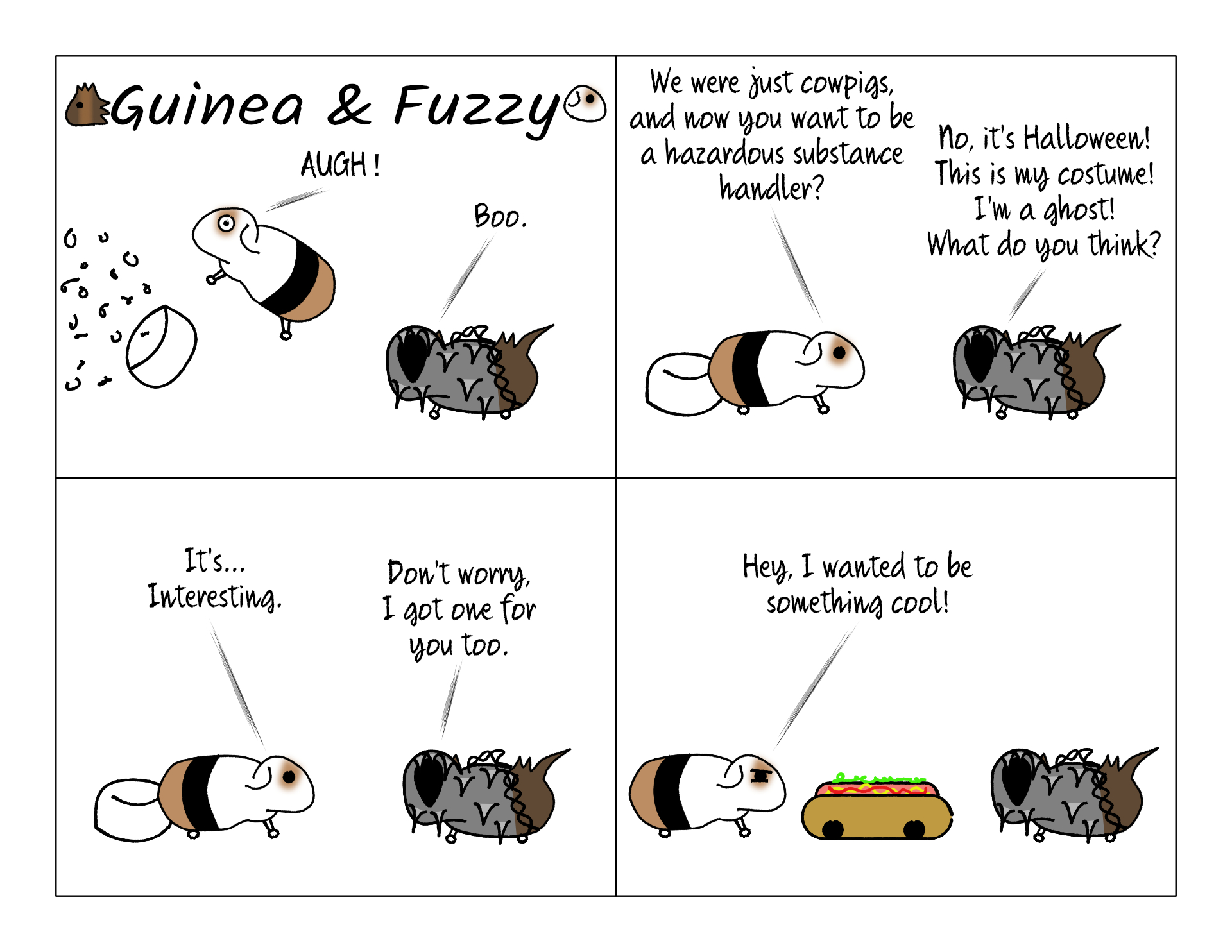Guinea's costume looks like an actual ghost costume for humans that exists. I like the idea that he'd wear tiny chains as part of his costume. I was going to have Fuzzy make a Toxic Avenger joke, but I figured few people would get it.