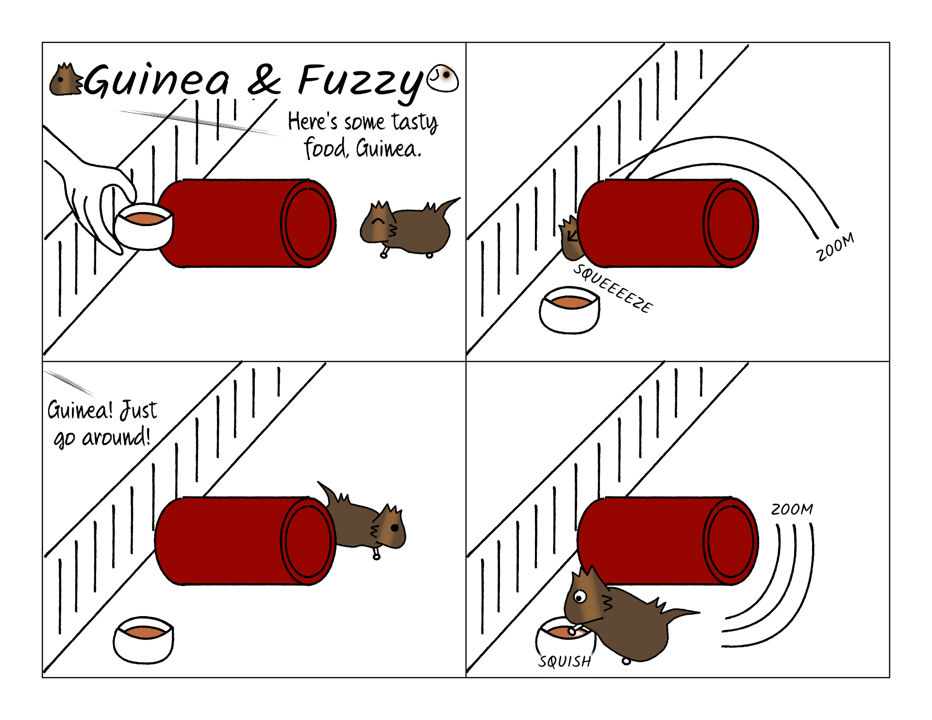 One day I fed him a fresh bowl of formula, and he was so excited to eat it, he tried to run through the narrow gap between the tunnel and the side of the cage. He was able to get his head through but couldn't squeeze his body! He finally realized what was happening, so he quickly ran around the tunnel. But he was running so fast, he stopped too late, stepped in his food bowl, and slid right across it! It was funny, because then he started eating, but there was a big foot-shaped canyon right down the middle.