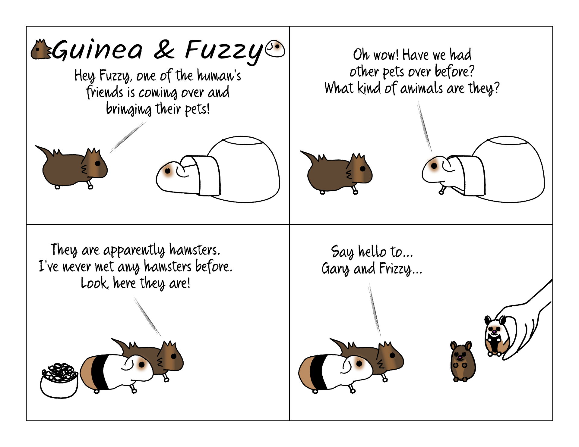 No, we've never had other pets in the house in real life. There was a dog interested in coming in, once. But we would not have trusted him around the pigs. Guinea pigs are social animals, but I'm not sure how much they'd enjoy schmoozing with stranger pets, even if they were fellow rodents.