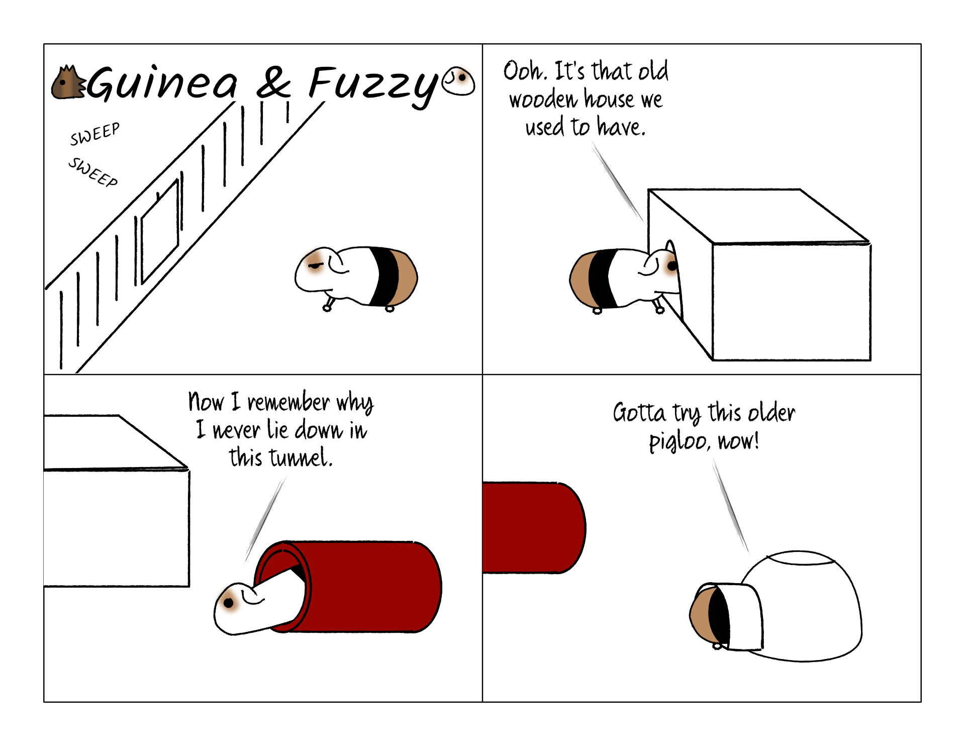 This is what Fuzzy did one time when we were cleaning the cage. We got him out and let him have floor time while we were cleaning. Of course we also had to remove all of the pigloos and hidey holes from the cage. So he went around, one-by-one, and briefly tried all of them.