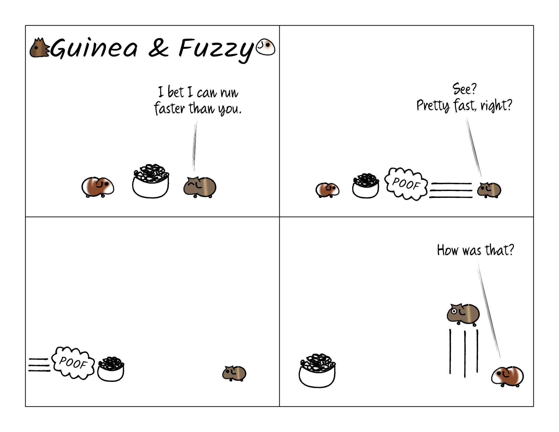The funniest exercise they like to do is "round the world," where they will stand back-to-front in a conga line. The pig in front will dash in a full circle around the cage, and end up standing behind the other pig in the blink of an eye. Then it's the other pig's turn. And they just keep going like this. Every time making a loud bang as they bump into something faster than the eye can see. Or break the sound barrier, one or the other.