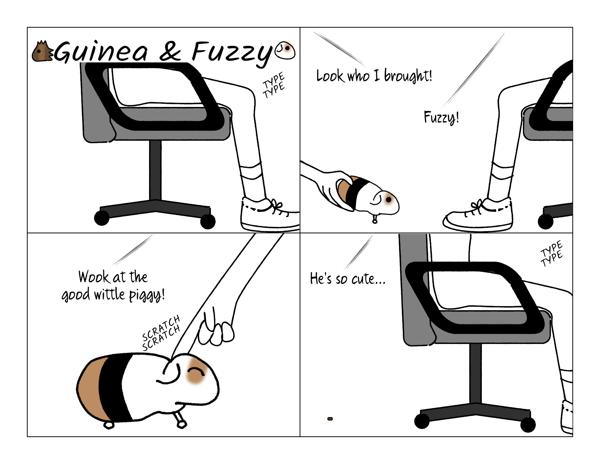Since I work from home, Fuzzy is free to come visit me when I work. But there is a carpet, so there's a limit to the amount of time he can stay before he's likely to wet it. He is extra cuddly and likes getting ear scratches during his visit, though.