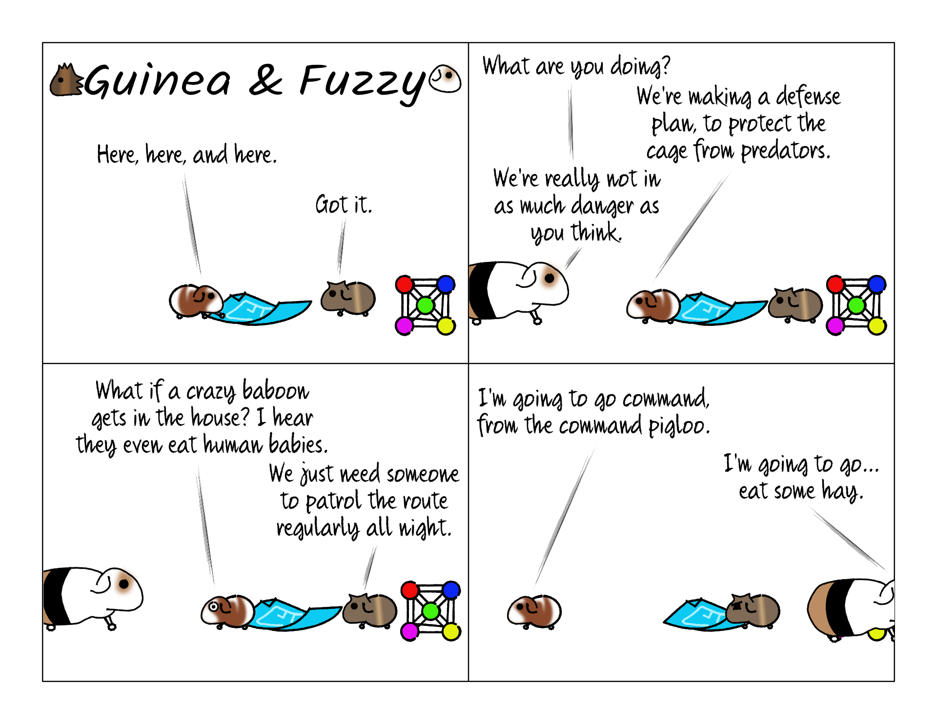 Bean seems on board with the nightly guarding. Rarely he will actually be dragged into guarding himself, but usually he just checks with Potato that it's safe before coming out for breakfast. Potato is the one stuck with guard duty every time.