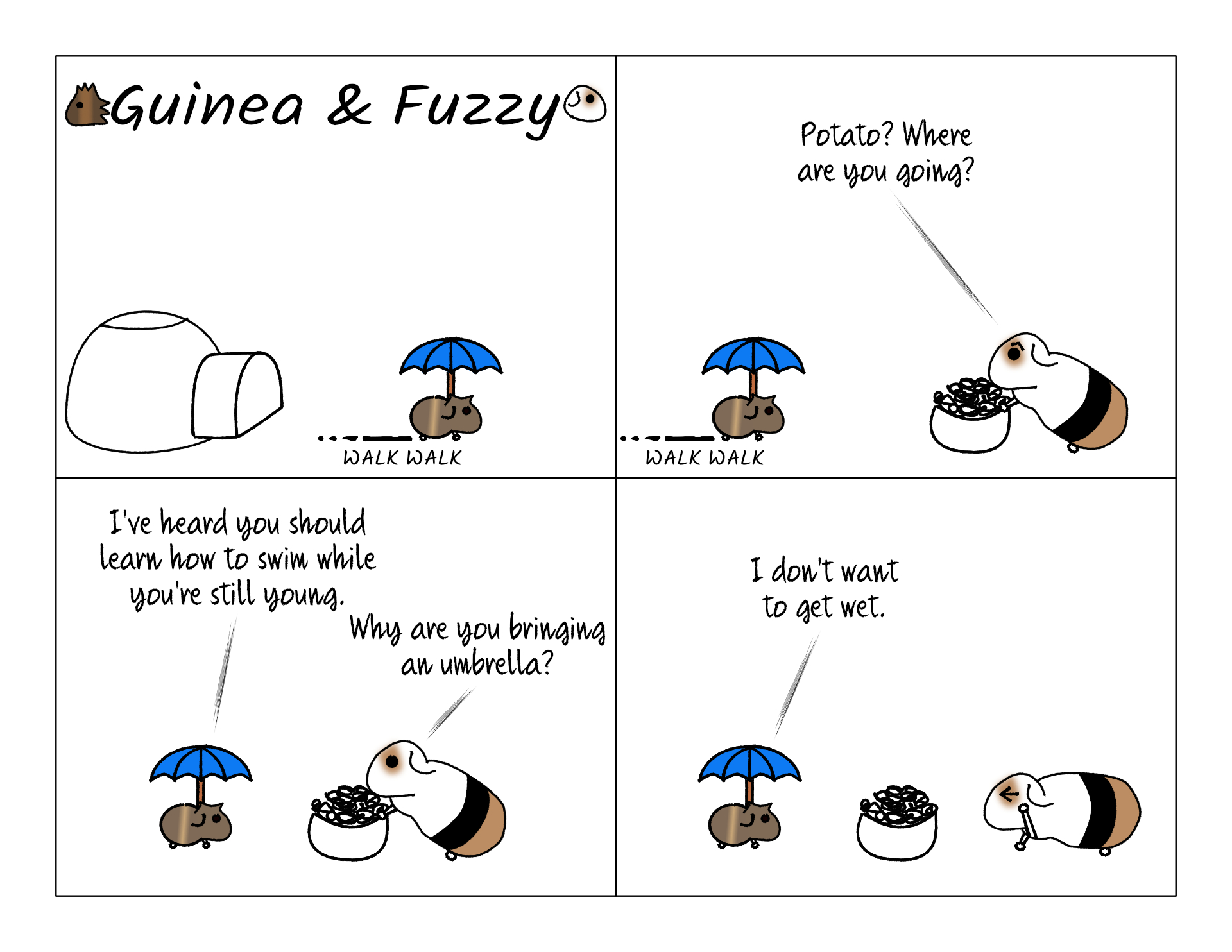 This is very ambitious of Potato, but actually guinea pigs hate swimming. They can kind of do it. But because their mouth and nose are below their center of buoyancy, it's very difficult for them to stay afloat and breath at the same time. I doubt Potato would ever volunteer to learn to swim. He sure didn't like it when he used to have to take weekly baths.