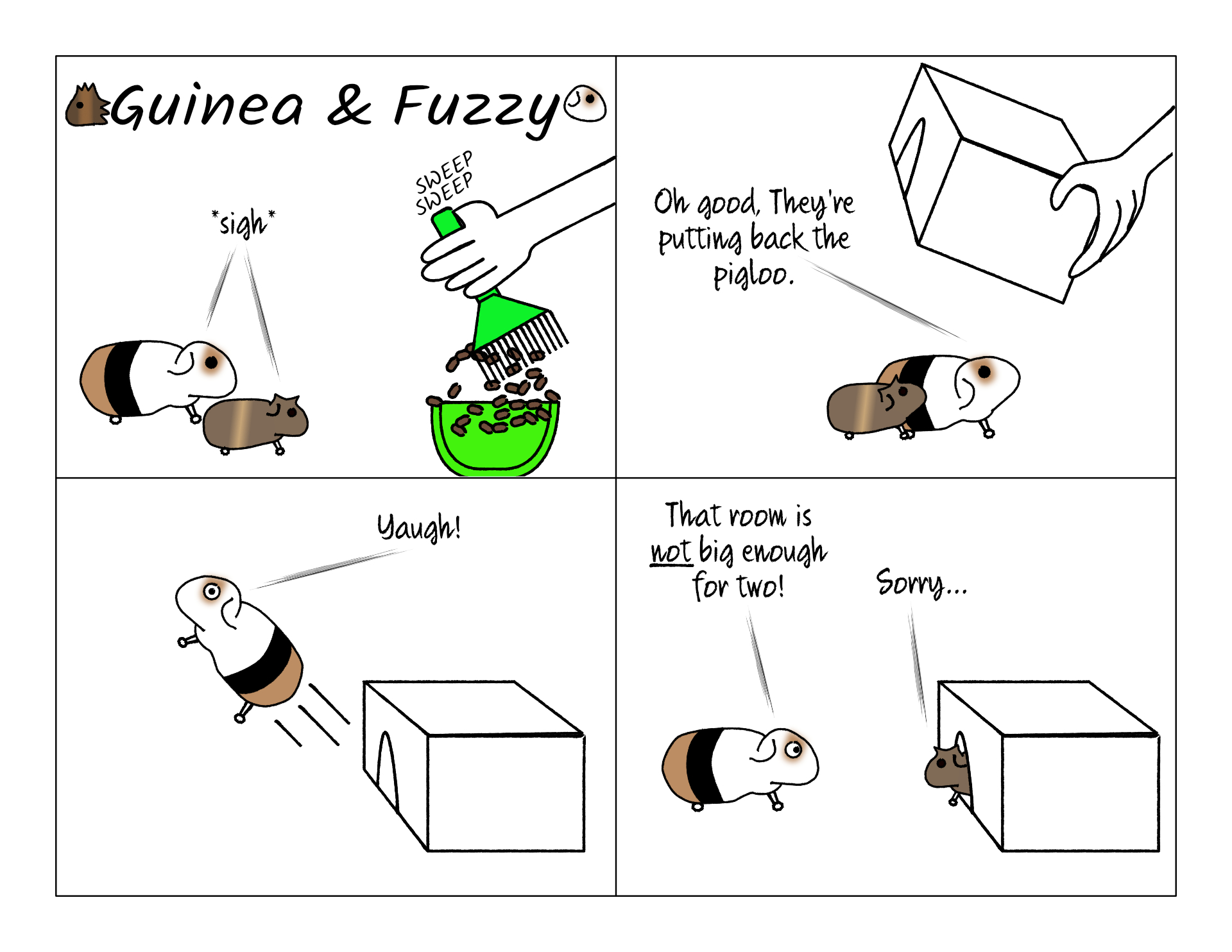 Every time I sweep up the blanky side of the cage, I have to remove everything from it. Then Potato and Fuzzy come in to check out what I'm doing and are surprised to see everything missing. So when I lower the pigloo back into the cage they're waiting for it, and they position themselves under it. Which makes it quite tricky to place around them without bumping them in the face.