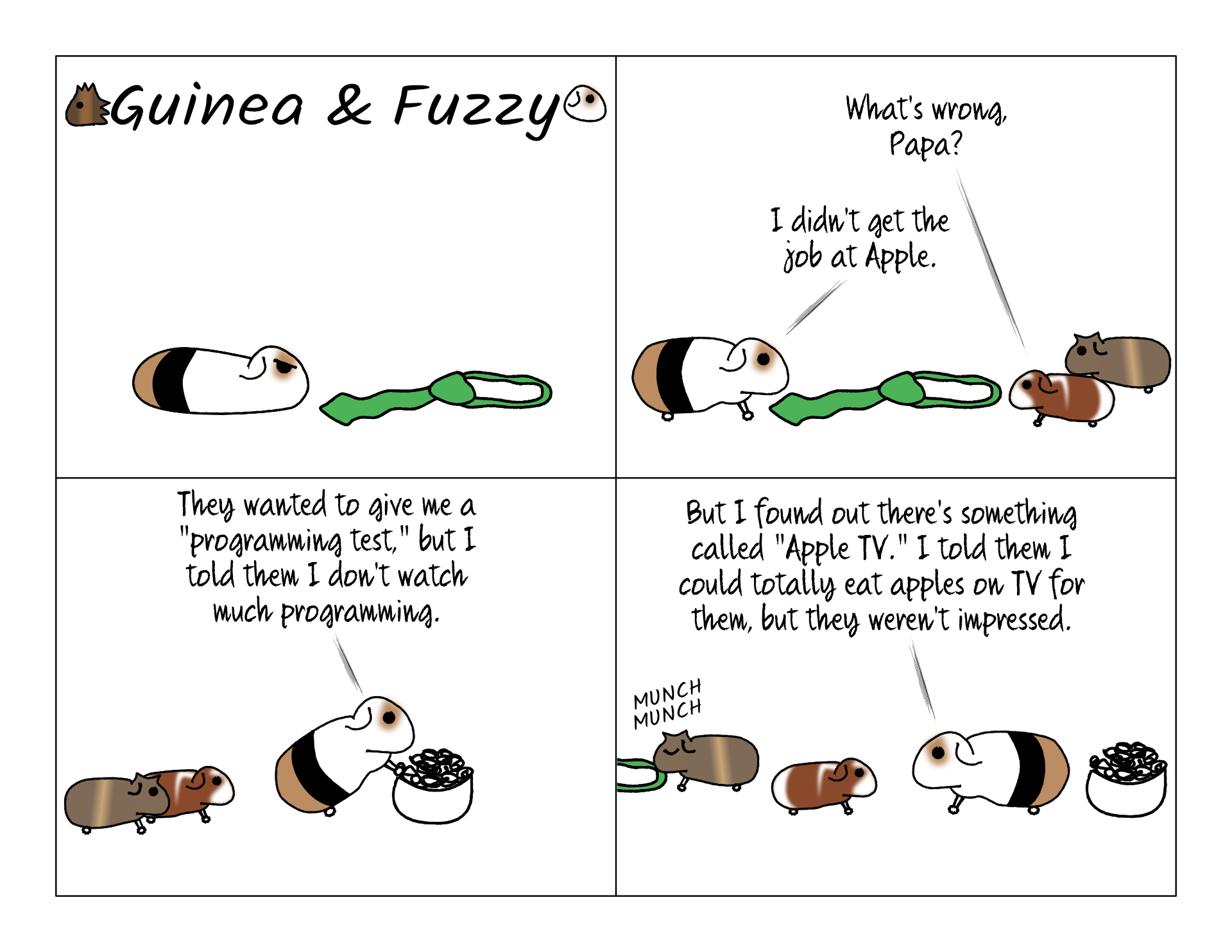 Don't worry, Fuzzy, no one passes their first interview. I hope Potato leaves that tie in one piece because Fuzzy is going to need it for the next one.