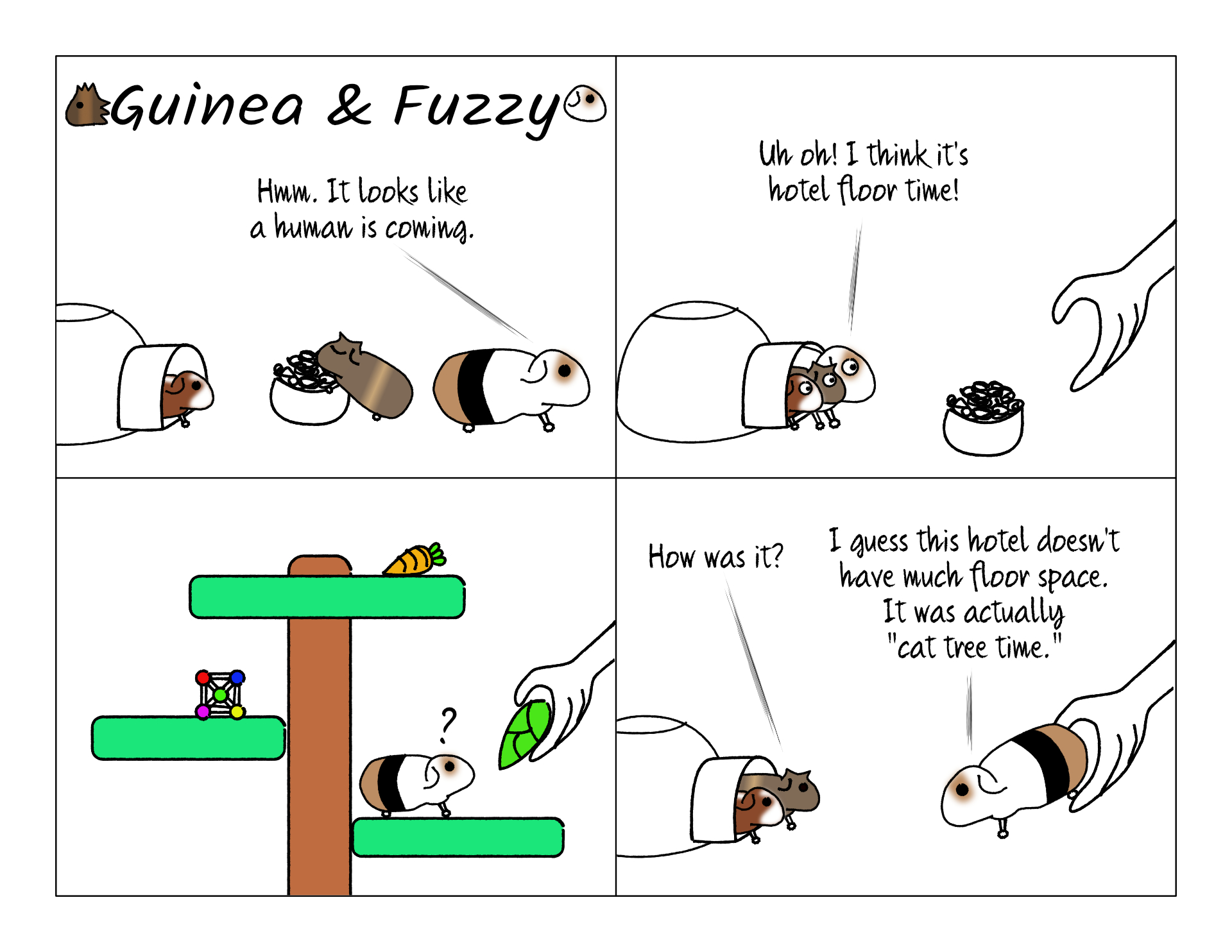 I don't know if it applies to guinea pigs, but the hotel website did say pets would get supervised floor time every day outside of their cage. There wasn't much floor space in the economy cat room, though. There was a cat getting his floor time while we were there for drop-off though, and it was just like that. The cat was lounging on the cat tree and one of the animal keepers was playing with him. The pigs might enjoy it, though it would be pretty scary to put them so high up, so I doubt that happened.