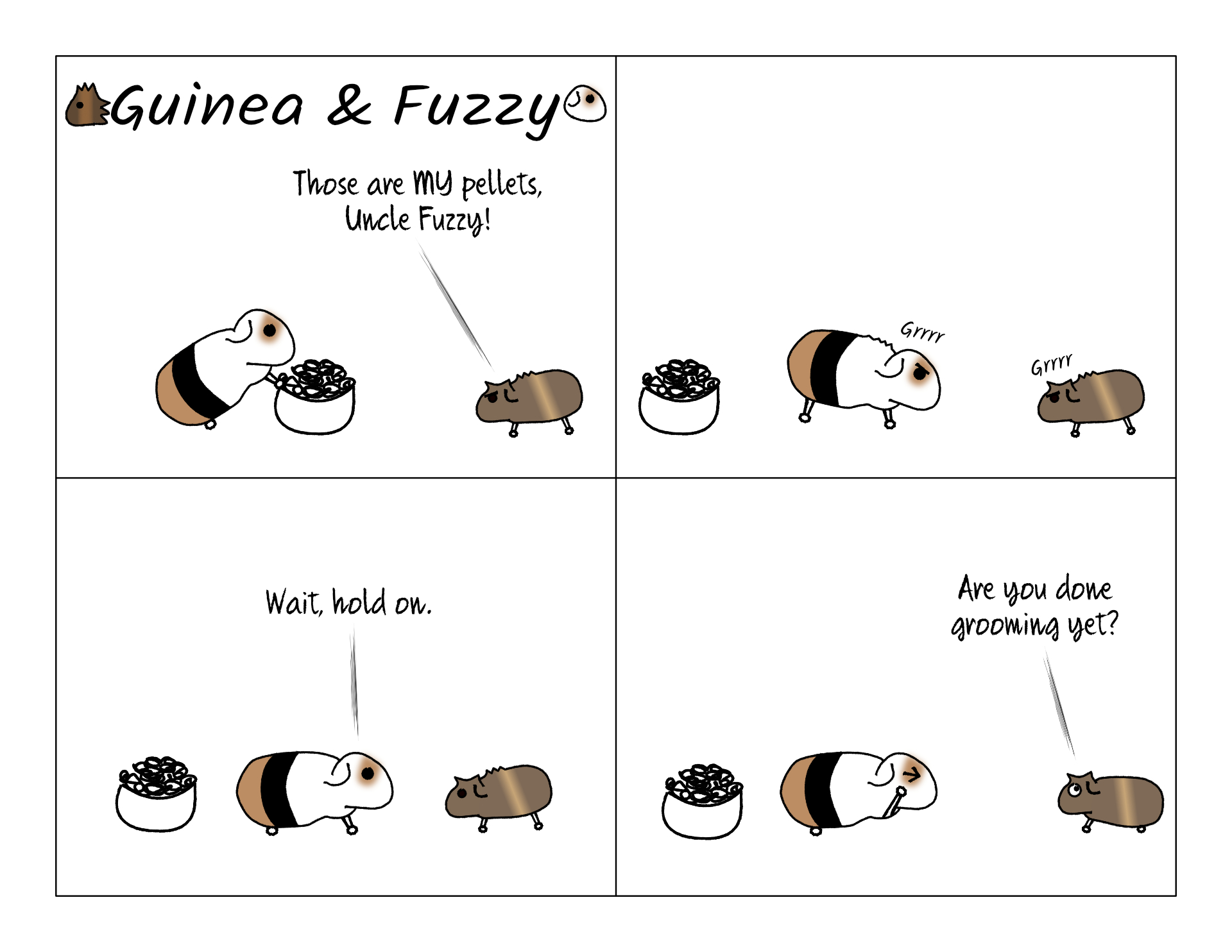 I read later that this is actually a documented behavior in guinea pigs. The alpha pig will interrupt a stand-off with a challenger to groom, as a sign that, "after I win this, we'll still be friends, so don't worry about it." Which is funny, because it's exactly how it came off, even by human body language standards.