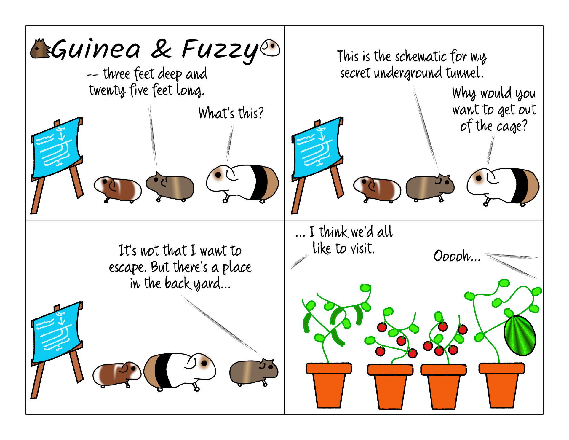 The pigs would never want to escape. They love it here. But if it means more and different types of veggies, they might be open to a little exploration. Although guinea pigs aren't burrowing animals by nature, they make their homes in naturally forming caves, so tunneling isn't something they're good at.