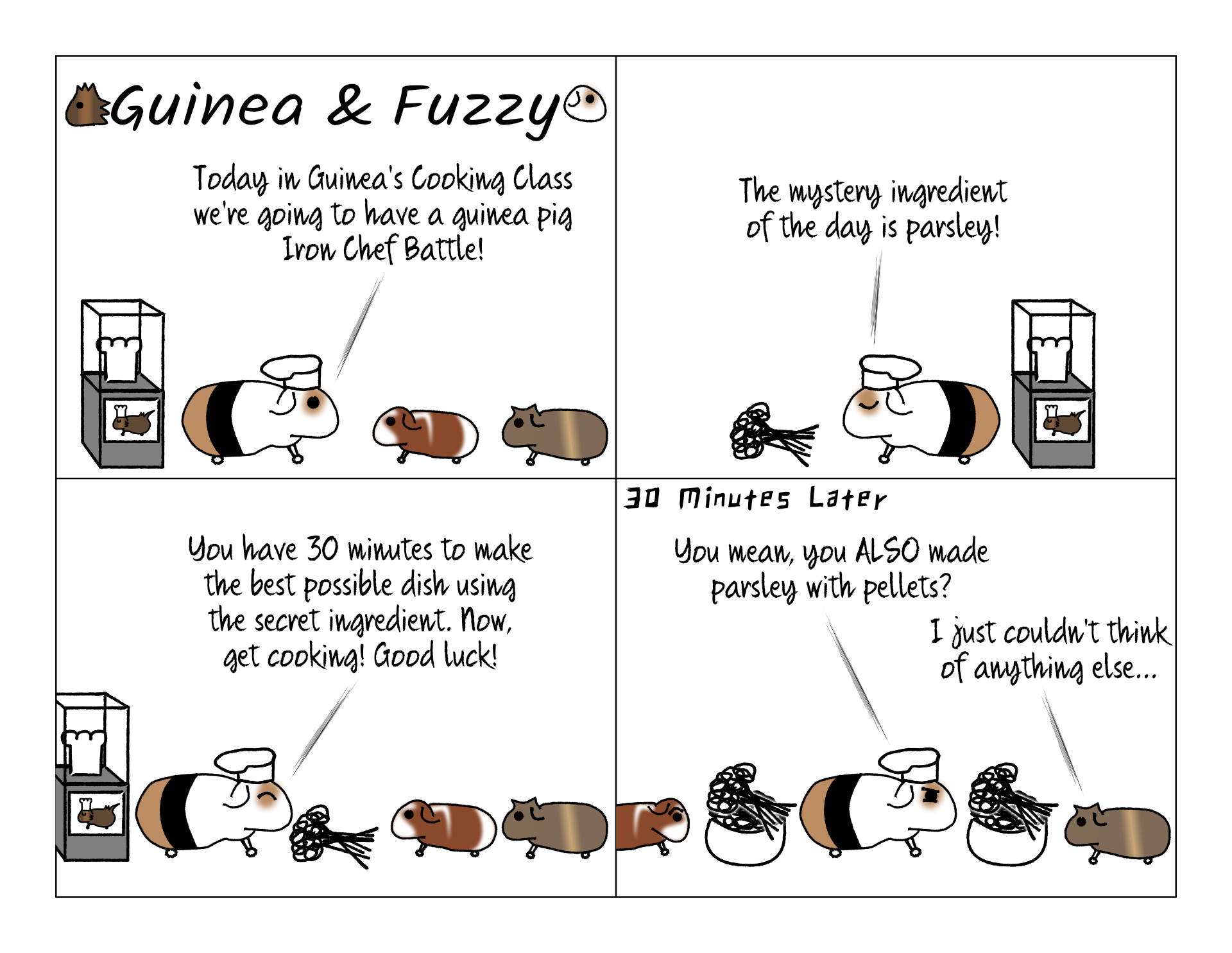At least the pigs all love parsley. So it makes sense that Chairman Fuzzy would pick it as the secret ingredient. There aren't a lot of other ingredients sitting around in the cage, though, so the baby pigs can be forgiven for making the same thing.