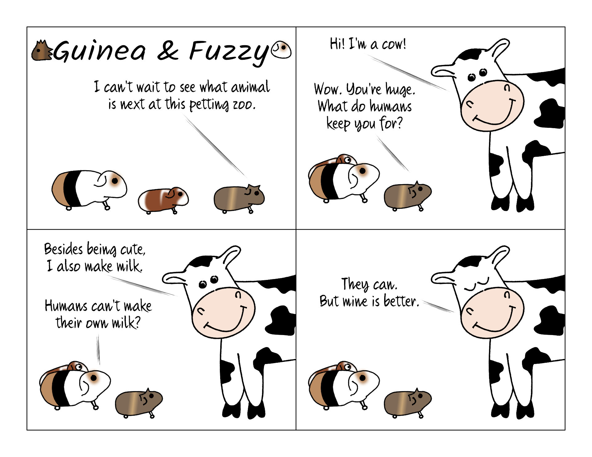 Did you know cows can be cute? They can! There's a cow at a farm near us who's super cute, even though she's fully grown and not a baby. She has super fluffy fur and is really soft and huggable. But also seriously stinks, unfortunately. If you happen to recognize the specific cow in this comic, it's probably a coincidence...