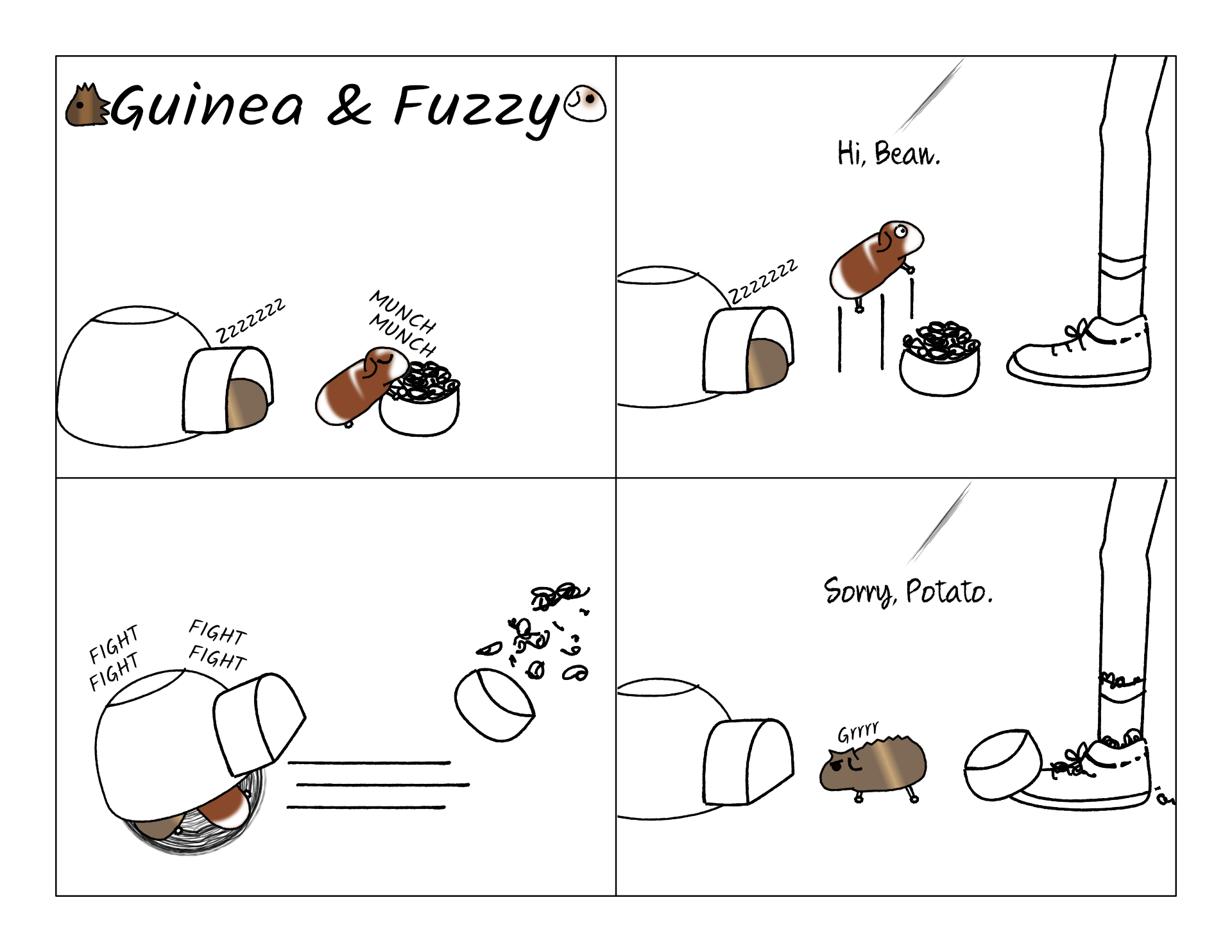 Potato is competitive enough that he growls and fights back. Fuzzy is confident in his dominance, though, and just rolls his eyes then comes out to see if we have food.