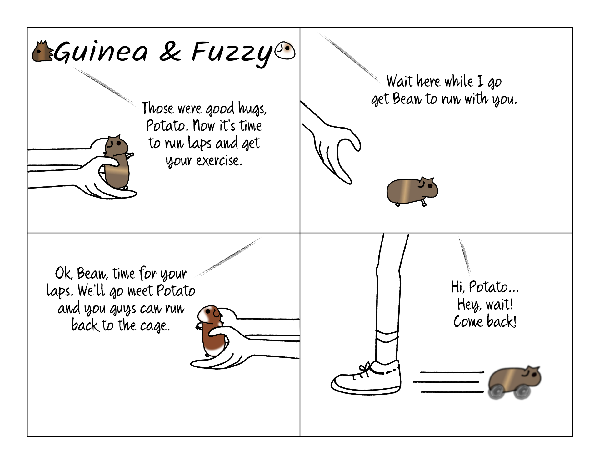 We learned quickly not to put Potato down first when it's exercise time. He's always itching to go, and as soon as we let him go he shoots off toward the cage. Meanwhile Bean prefers a running partner. It's hard to get him to go when no one else is there, and he's also rarely the pig that leads when there's a group. Instead he'll look for the nearest human to cuddle up next to. So he really needs Potato to run with him.