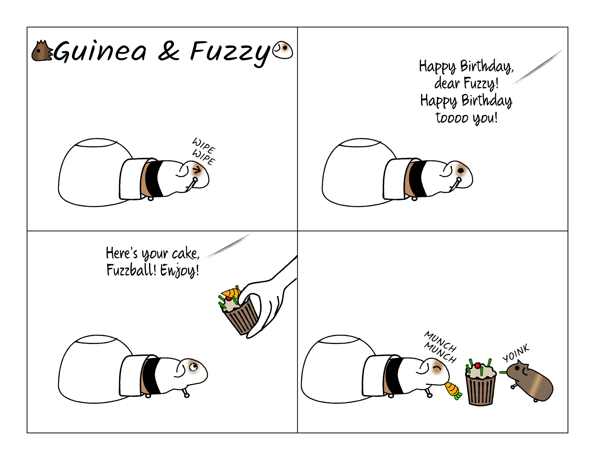 We really did catch Fuzzy while he was grooming. Of course we didn't know, since we had been busy preparing the cake. Poor Fuzzy, if you look closely you can see his grooming liquid in the photo. Guinea pigs secrete a sort of hair conditioner from their tear glands, and that's how they keep themselves so shiny and clean. But it means if you catch them before done, there's white creamy goop in their eyes they haven't spread around yet.