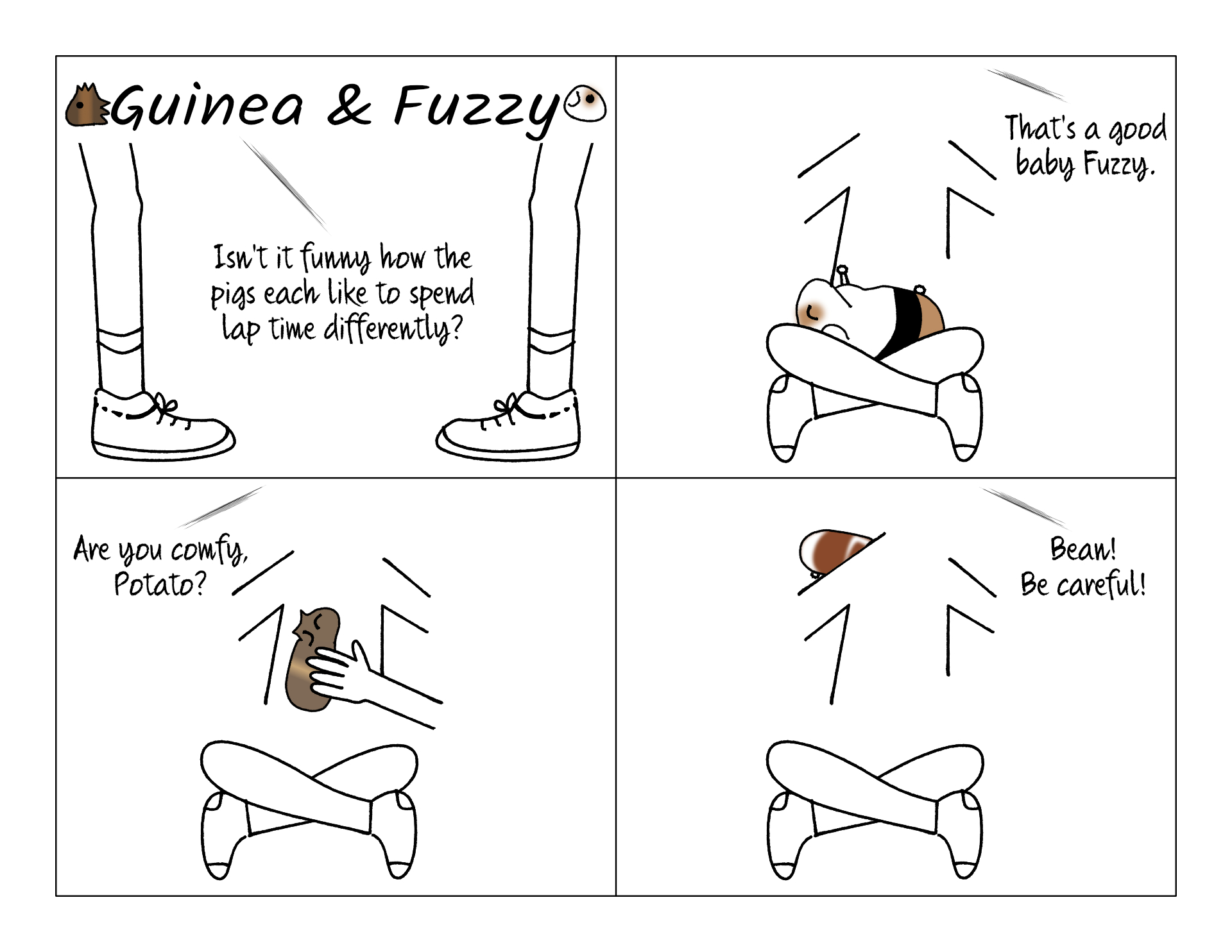 The other pigs hate lying on their backs. They will freak out immediately. Potato likes to sit on our chest facing us. He usually looks directly at us and makes quiet wheeking sounds, or works on grinding down his teeth, which is healthy and normal. And he doesn't mind a hug or a pat while he's doing it.