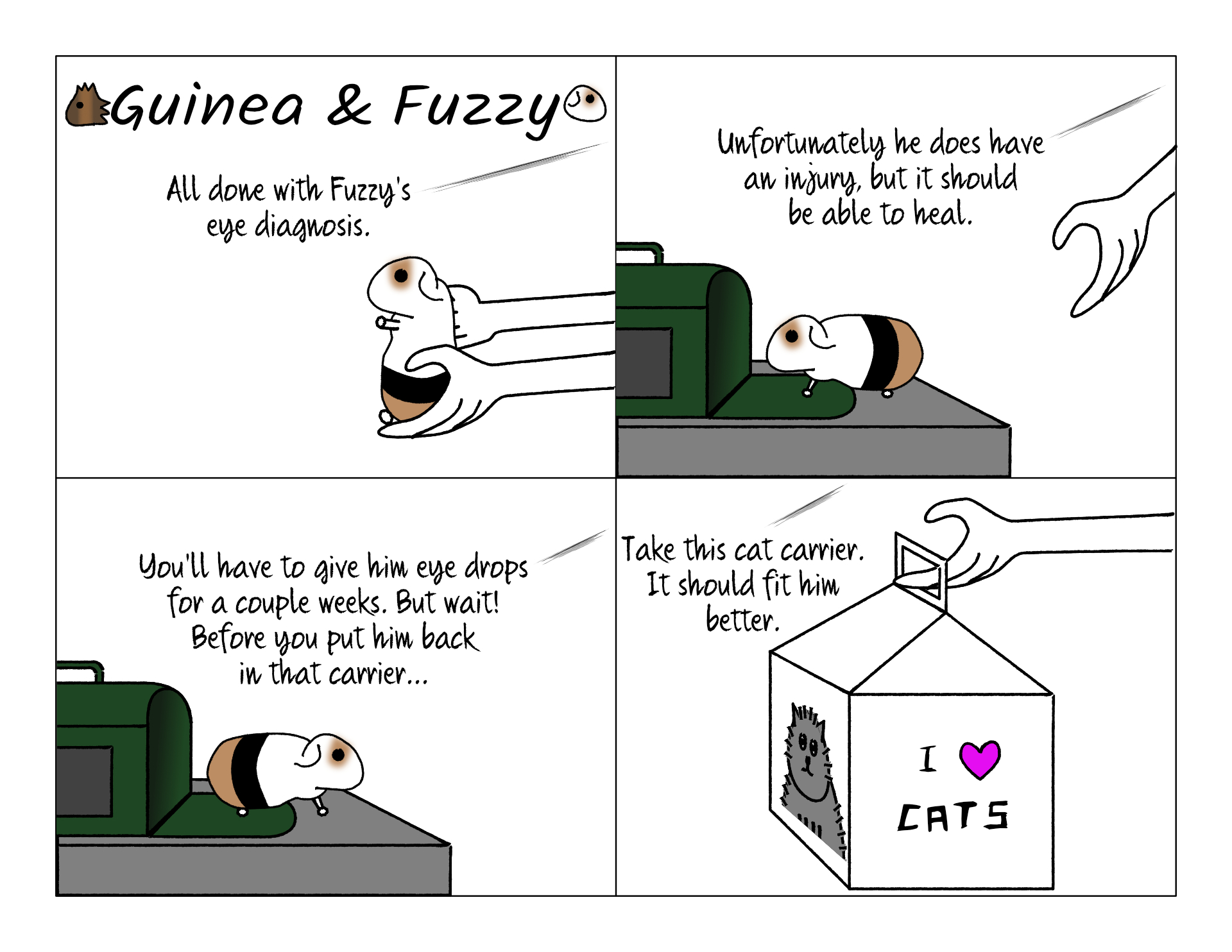 The vet complained about our tiny pet carrier a couple of times. We bought the only guinea pig carrier in the pet store, but Fuzzy is much larger than your average guinea pig. She finally had enough and gave him a cardboard cat carrier.