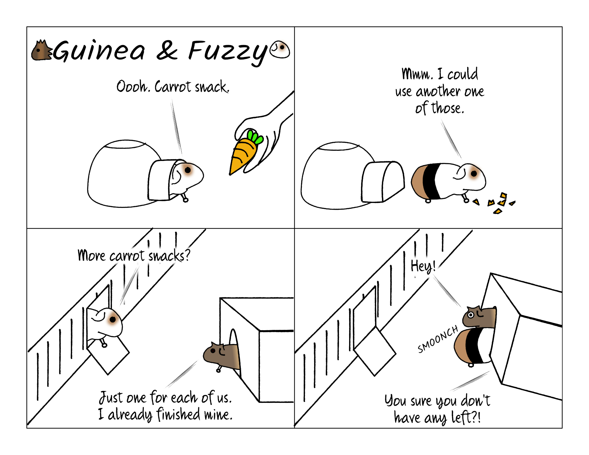 Potato's just lucky he actually did finish the snack before Fuzzy came looking. Often Fuzzy finishes way faster than the other two, which leave him time to steal some of the snack out of their mouths.