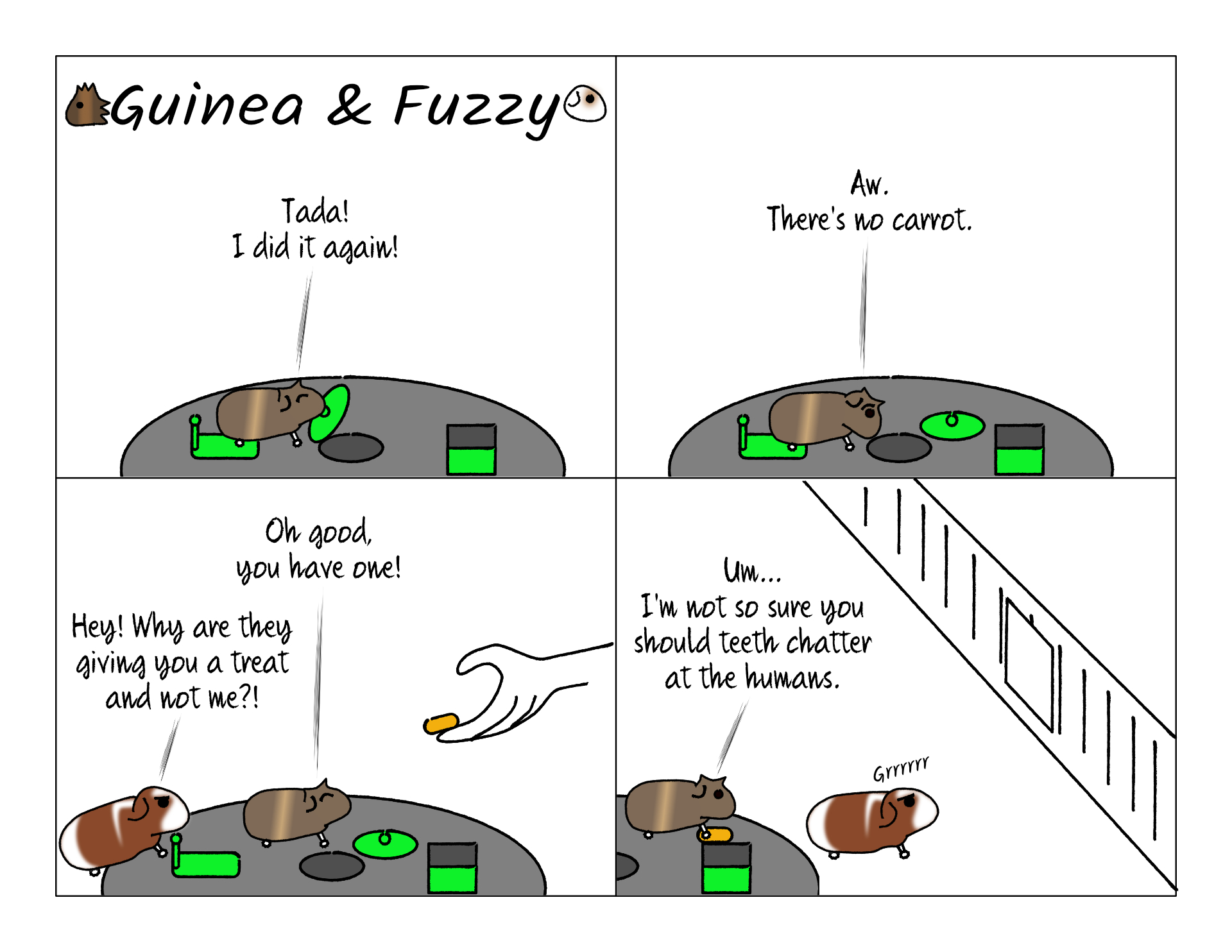 Believe it or not, Bean does teeth-chatter at us sometimes. Usually when he's in the cage he's hiding in one of the pigloos. And when he's in our laps he's docile and content. But if the other pigs rile him up enough, or he gets jealous, he'll teeth chatter at them and sometimes even direct it at us. Nothing a little bit of carrot won't solve.