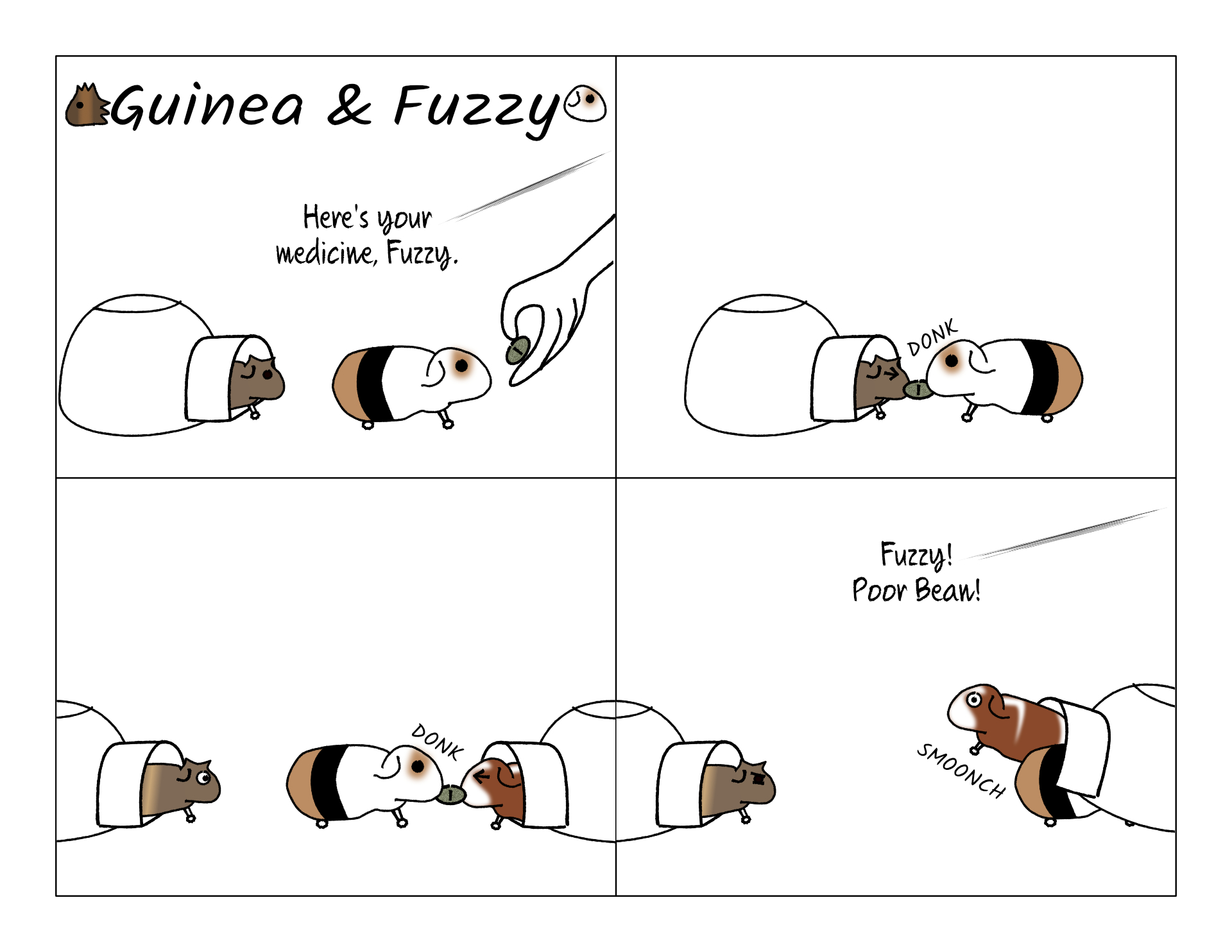 Fuzzy often smacks the other pigs in the face with his precious treat by accident. He doesn't realize they're there until he turns around with it sticking out from his mouth, and it swipes right across their noses. Especially because he's looking for a pigloo to hide it to eat in safety. Usually if the pigloos are occupied he just faces a corner.