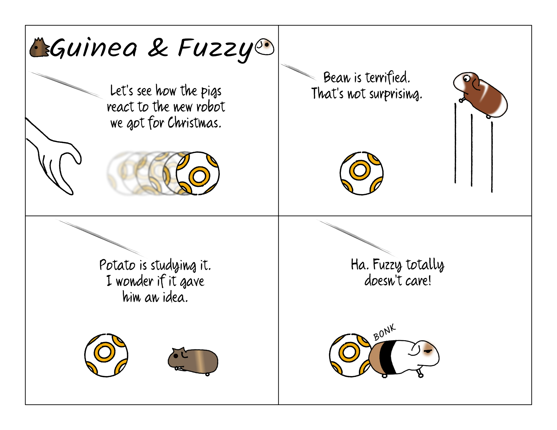 We got one of those round programmable robots for Christmas. It wasn't actually BB-8 colors, but you get the idea. Since it runs around on the floor, and it's roughly guinea pig sized, we thought it would be fun to see how the pigs reacted. We didn't get a ton of reaction. Fuzzy wouldn't even look at it. Potato watched it closely but didn't really interact.