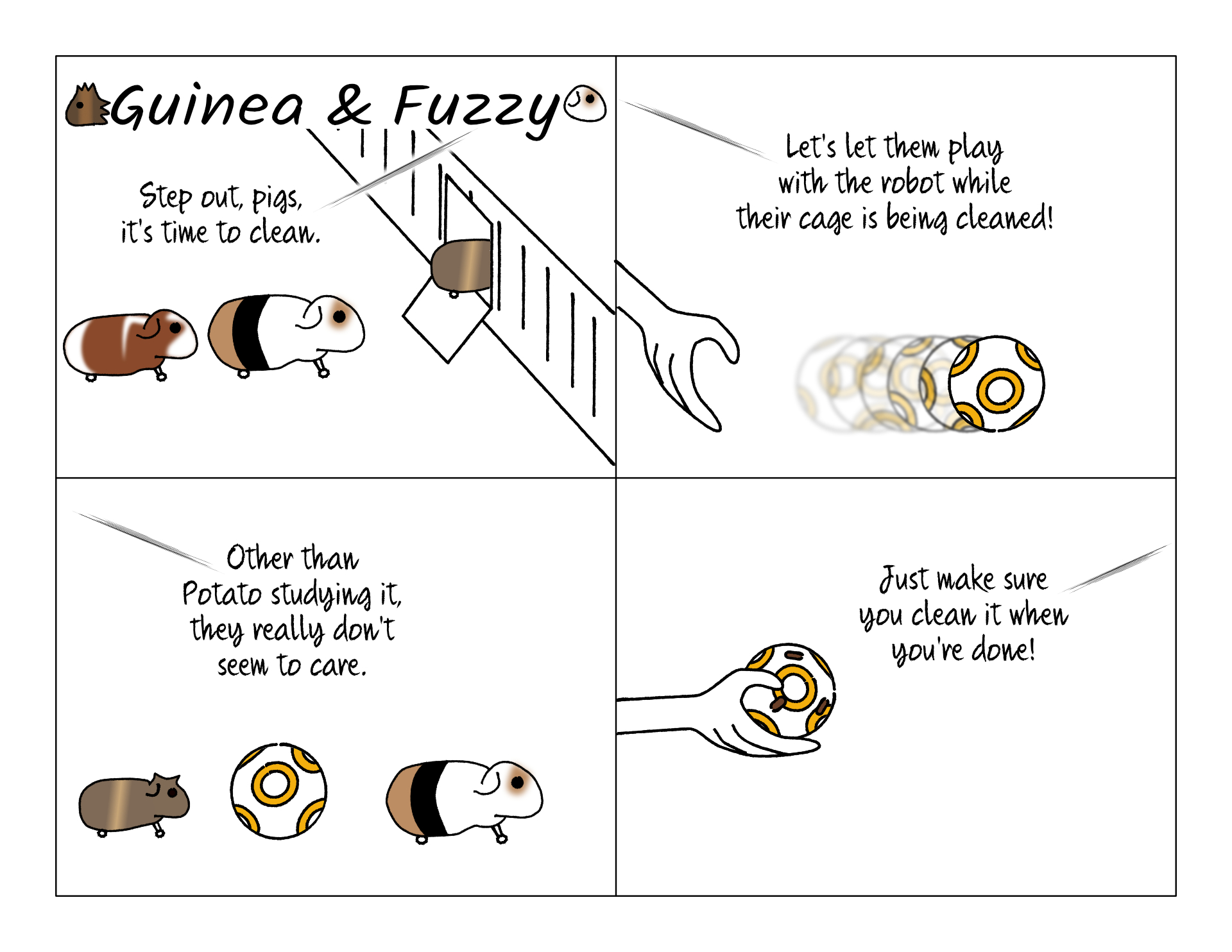We were so surprised they pigs had no reaction the first time they met the robot. So we decided to try again. We figured we'd let it roll around while they were getting floor time during cage cleaning. Even though they're usually pretty bored during cage cleaning, they still didn't really interact with it. Only Potato even seemed to notice it.