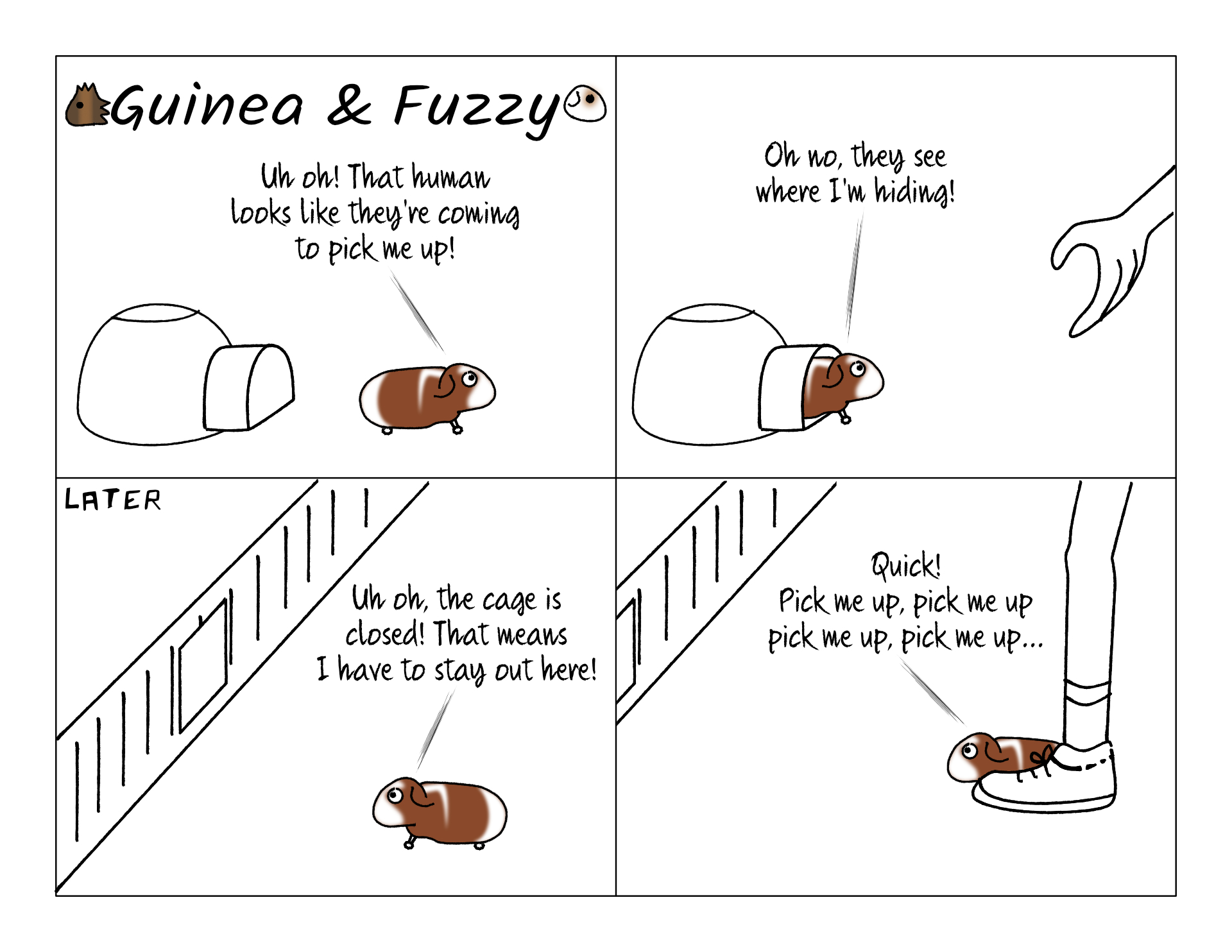 If he's scared of his environment, he'll even hide near us and wait to be picked up. But then we get him back to the cage, he darts right for the nearest hidey hole.