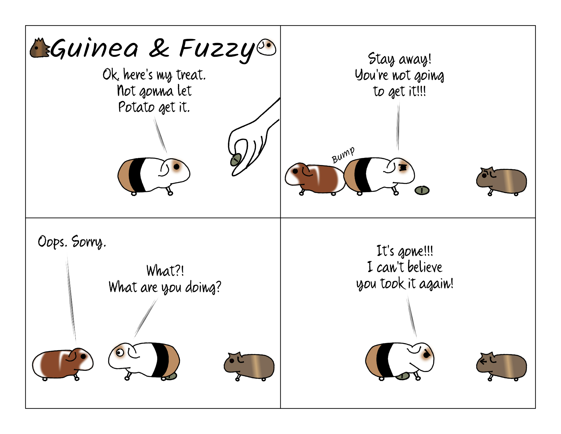 I had to risk my finger trying to point at where it went. He though I was giving him a replacement. See, guinea pigs' eyes don't look at the ground, so once it's below the chin, it's gone.