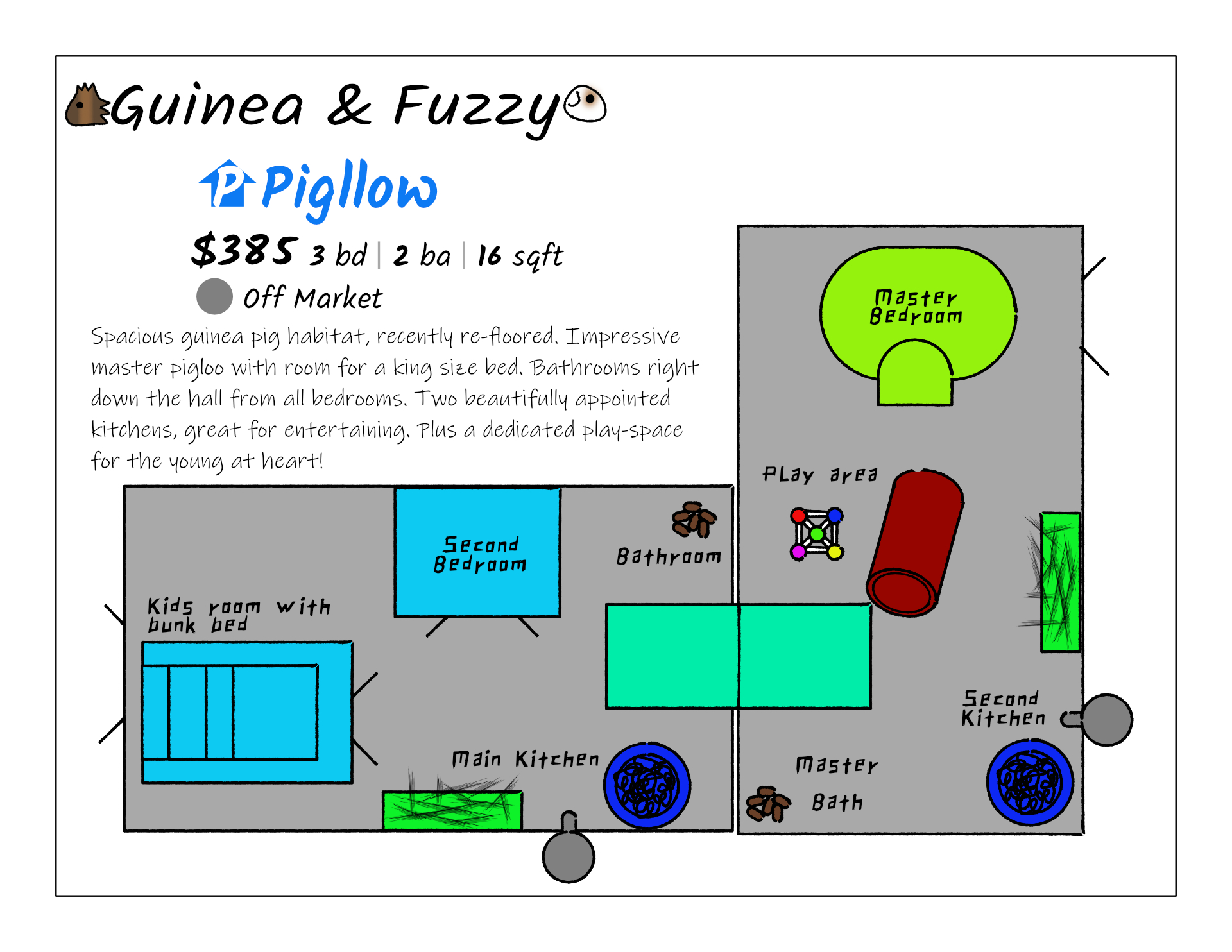 These are all accurate statistics. I calculated the "Pigstimate" by adding up the cost of the cage and everything in it. Of course, that doesn't include all of the backup cage liners we have so we can change it once a week. And of course it doesn't include a few toys and other accessories that don't live in the cage all of the time.