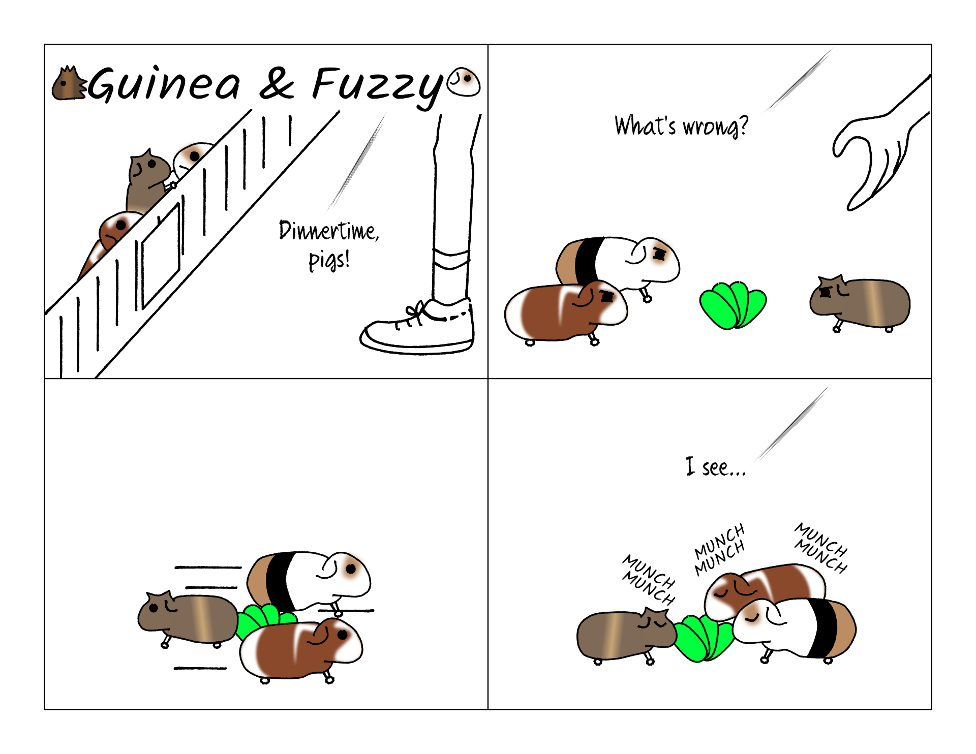 The pigs have settled into a pattern of begging for dinner in a little triangle. Potato stands in the front, on his hind legs, and begs for the group, and the other two stand behind ready to receive the food. I give Potato a bite for being a good boy, then put the rest between them and they all arrange themselves facing inward to eat.