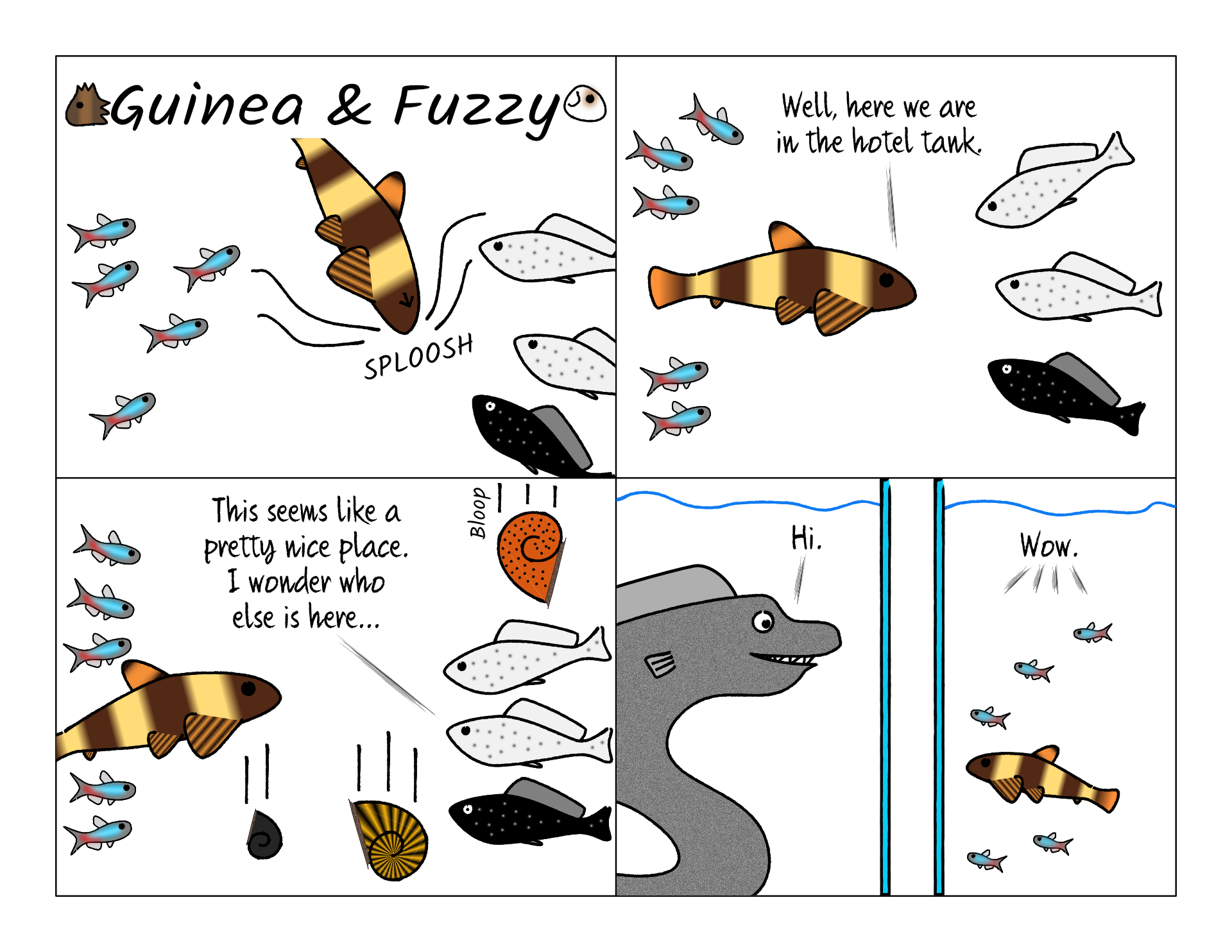 They also got to check out all the interesting fish in the neighboring tanks. There were platys, cichlids, you name it. And there really was a large eel! Though he was catty-corner to them, not right next door.
