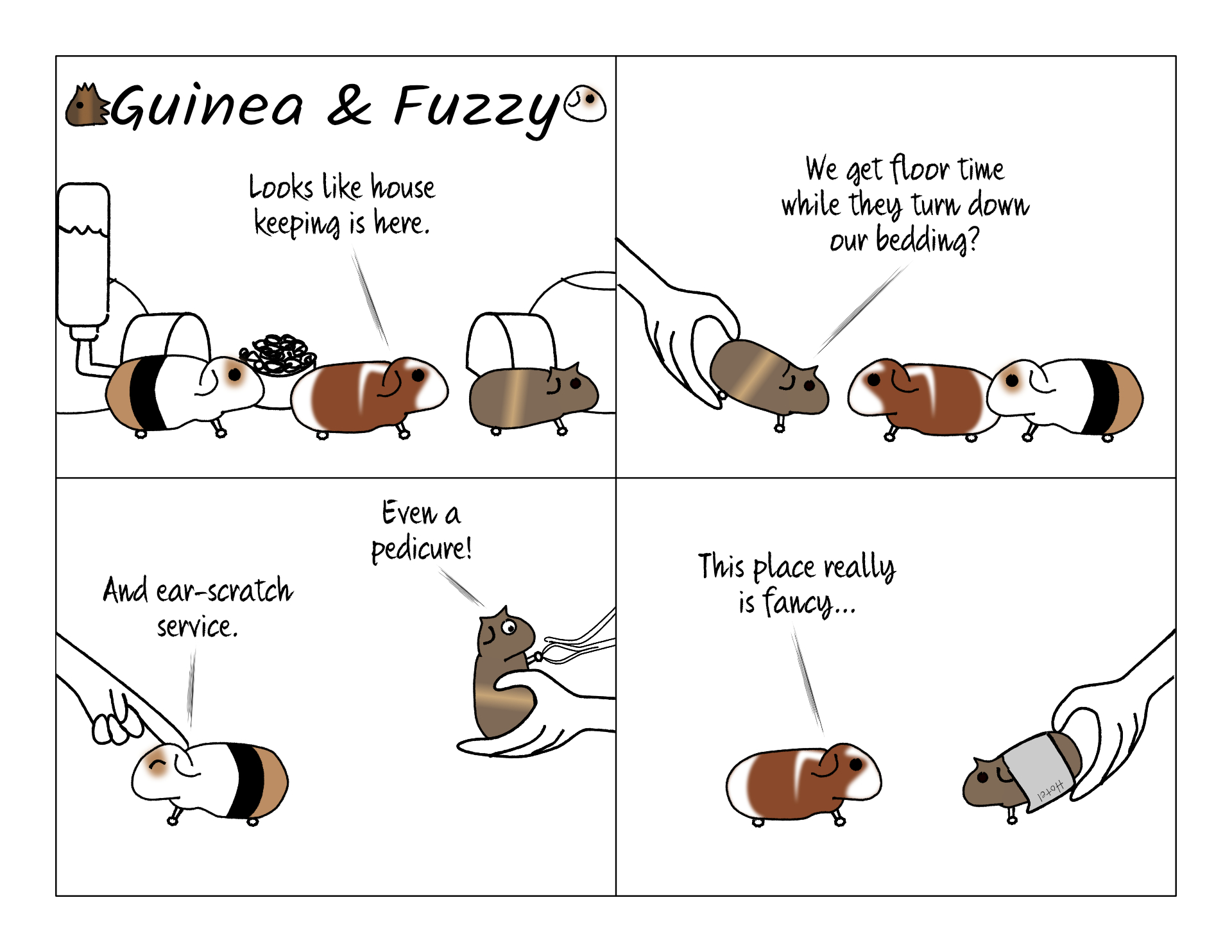 It really is a pretty fancy place. The pigs really do get floor time and daily cage cleanings. They get to run around the cat room and explore, and the staff said they did enjoy it and not just sit in one place. They also offered a pedicure and cuddle time for an extra fee. We got them the pedicure because we figured the professionals would do a better job than us for once.